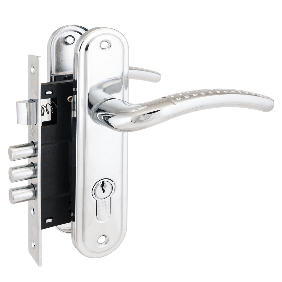 Серия "Лайт". Замок врезной с ручками. Предназначен для установки в деревянные двери толщиной до 40мм, правого и левого открывания. Дверь может быть закрыта на защелку и открыта с помощью фалевой ручки при открытом засове замка. Три стальных ригеля круглого сечения диаметром 12мм, вылет 20мм. Универсальная защелка. Стальной корпус с подшипником, покрыт полимерной краской. Межосевое расстояние 61,5мм. Удаление ключевого отверстия 40мм. Материал ручек - сплав алюминий. Гальваническое покрытие. Комплектация: цилиндровый механизм 60мм, 5 ключей, ответная планка.