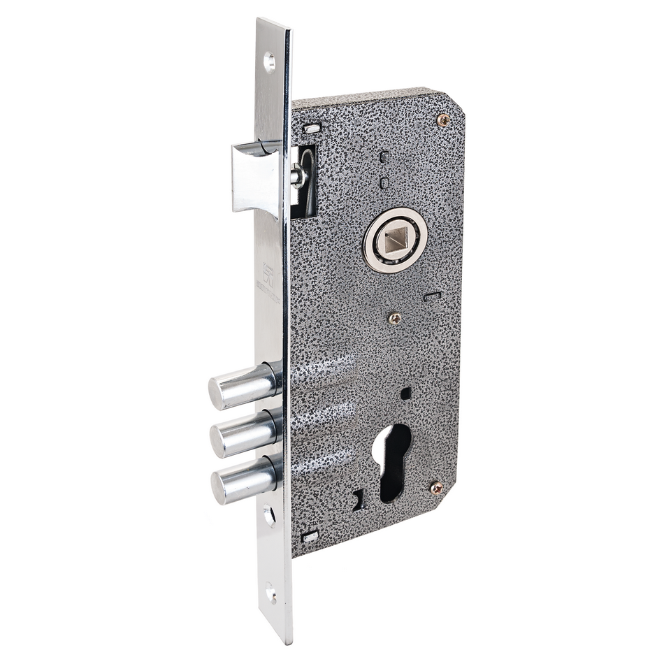 Замок врезной цилиндровый, без механизма секрета. Предназначен для установки в деревянные двери. Три цилиндрических стальных ригеля, диаметр 12мм. Вылет ригелей 20мм. Удаление ключевого отверстия 45мм. Межосевое расстояние 85мм. Цвет торцевой планки - хром, ширина 22мм