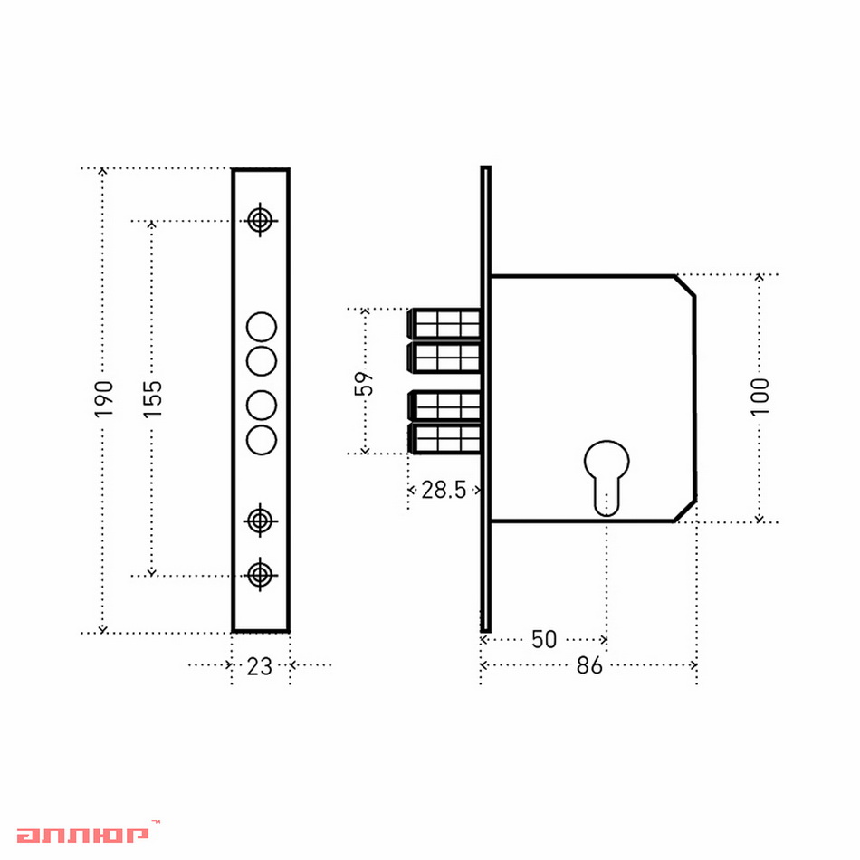 Замок врезной цилиндровый, комплектуется цилиндром 60мм, с английским ключом. Предназначен для установки в деревянные двери. Корпус - стальной покрыт серой эмалью, засов из четырех стальных цилиндрических ригелей. Вылет засова 28,5мм. Удаление ключевого отверстия 50мм. Ширина торцевой планки 23мм, гальваническое покрытие, цвет - хром.