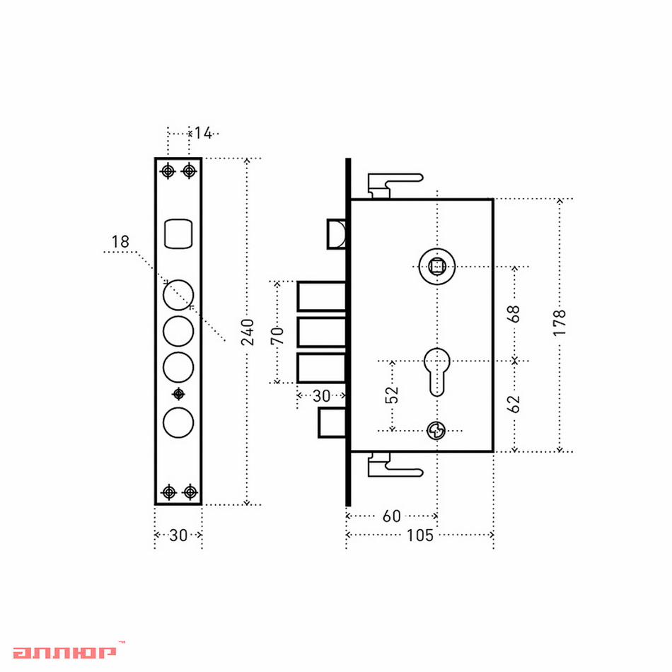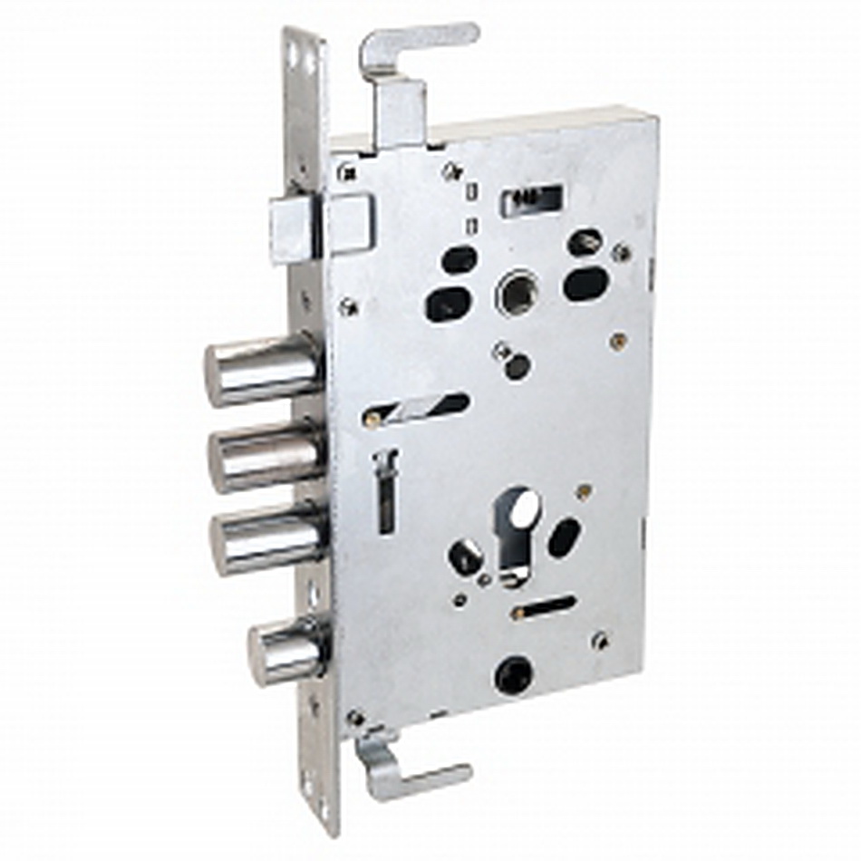 Замок врезной цилиндровый с защелкой и задвижкой, без механизма секрета. Предназначен для установки в китайские металлические двери, в качестве основного замка. Три цилиндрических стальных ригеля, диаметр 18мм. Вылет ригелей 30мм. 3 точки запирания. Корпус замка - сталь, толщиной 1,1мм. Удаление ключевого отверстия 60мм. Межосевое расстояние 68мм. Расстояние от центра механизма секрета до задвижки 52мм. Цвет торцевой планки - хром, ширина 30мм.