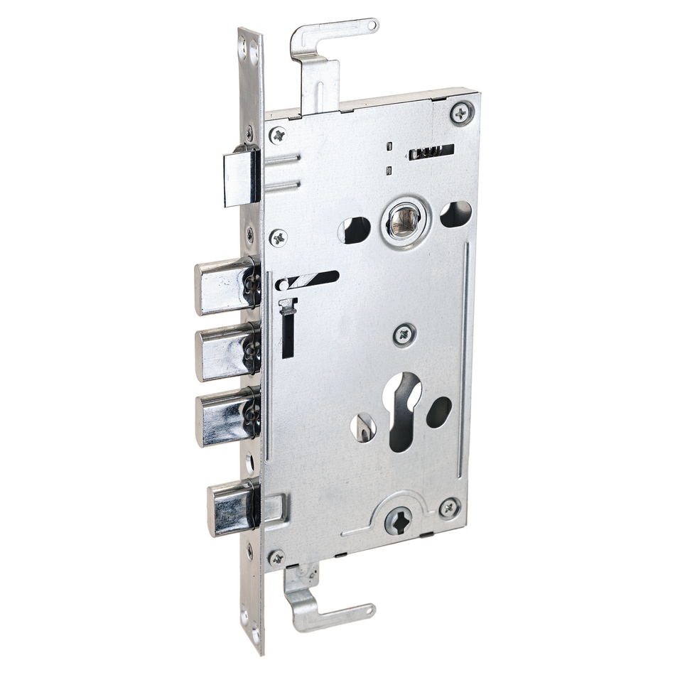 Замок врезной цилиндровый с защелкой и задвижкой, без механизма секрета. Предназначен для установки в китайские металлические двери, в качестве основного замка. Реверсивная защелка позволяет устанавливать замок на правые и левые двери. Три прямоугольных стальных ригеля. Вылет ригелей 20мм. 3 точки запирания. Корпус замка - сталь, толщиной 1,1мм. Удаление ключевого отверстия 60мм. Межосевое расстояние 68мм. Расстояние от центра механизма секрета до задвижки 52мм. Цвет торцевой планки - хром, ширина 24мм.