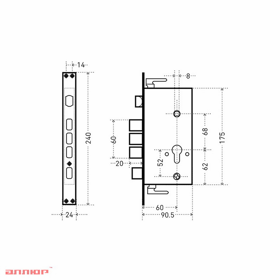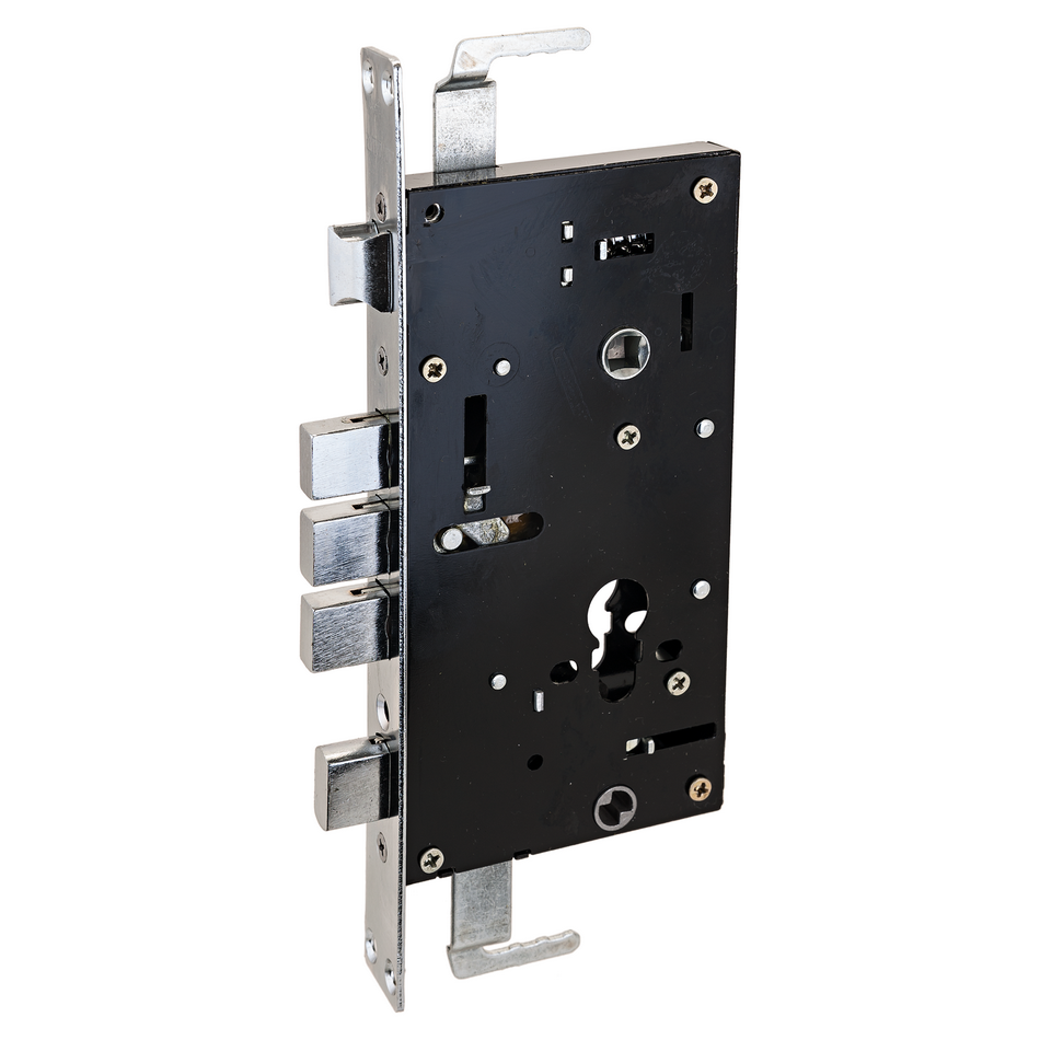 Замок врезной цилиндровый с защелкой и задвижкой, без механизма секрета. Предназначен для установки в правые китайские металлические двери, в качестве основного замка. Замок закрывается снаружи автоматически, поднятием ручки вверх. Три прямоугольных стальных ригеля. Вылет ригелей 20мм. 3 точки запирания. Корпус замка - сталь, толщиной 1,1мм. Удаление ключевого отверстия 60мм. Межосевое расстояние 68мм. Расстояние от центра механизма секрета до задвижки 52мм. Цвет торцевой планки - хром, ширина 24мм.
