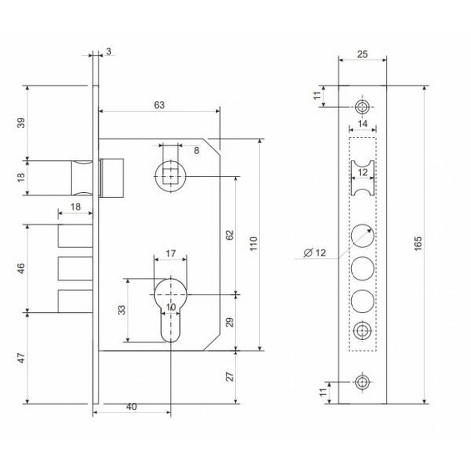 Врезной замок 1000/60-CR Apecs без ручек сертифицирован на 2 класс по российскому ГОСТ, а по безотказности работы засова и защёлки соответствует 4 классу. ЗВ 1000 Апекс с тремя ригелями и защелкой предназначен для установки во входные и межкомнатные двери. Технические характеристики: цилиндрические ригели; вылет ригелей 20 мм; диаметр ригеля 12 мм; удаление ключевого отверстия (Backset) 40 мм; межосевое расстояние 61,5 мм; механизм секретности цилиндровый; универсальная классическая защелка; неавтоматическое запирание; крепление лицевой планкой, покрытие гальваническое, цвет покрытия хром (серебро). Корпус врезного замка Апекс ЗВ 1000/60 комплектуется цилиндровым механизмом 60 мм.
