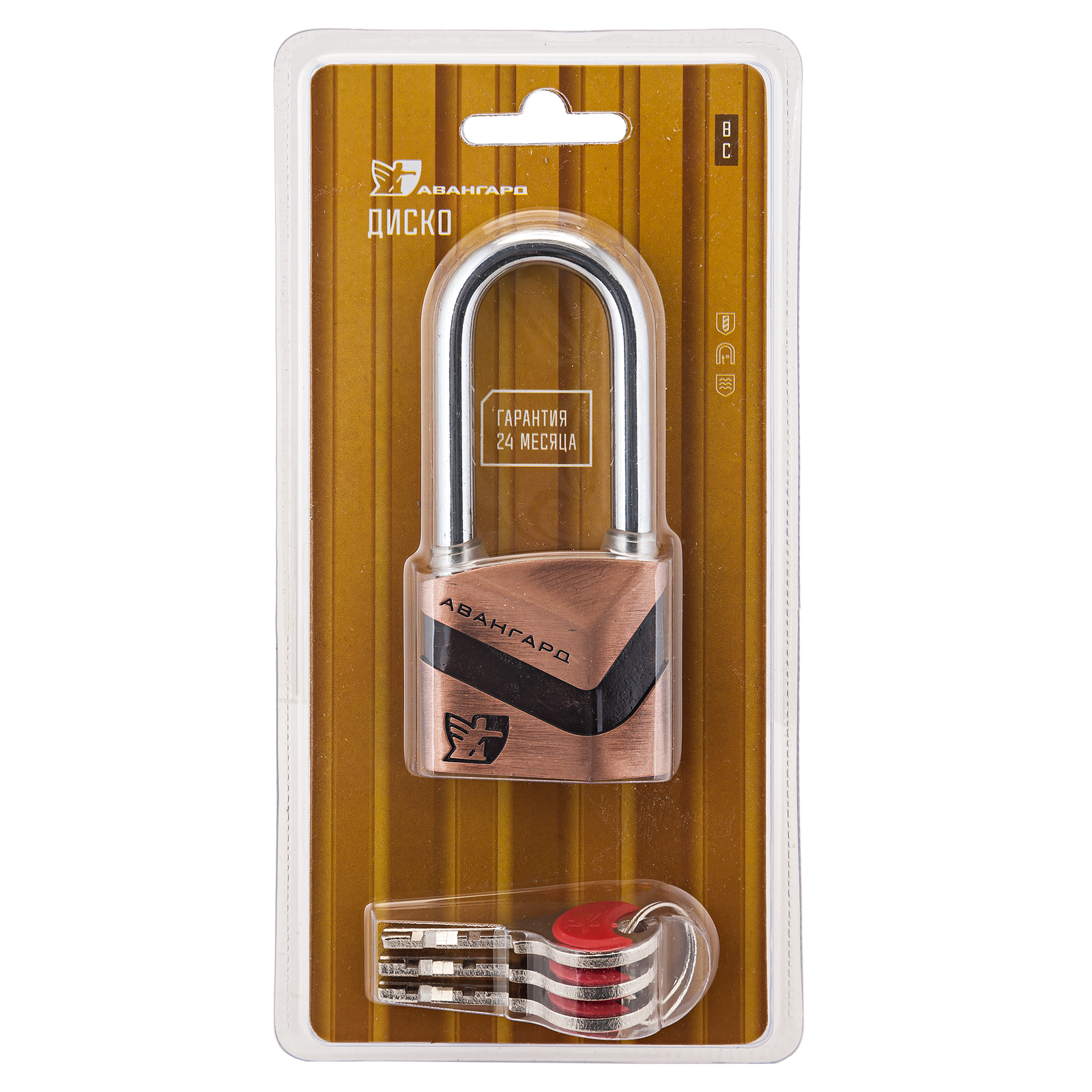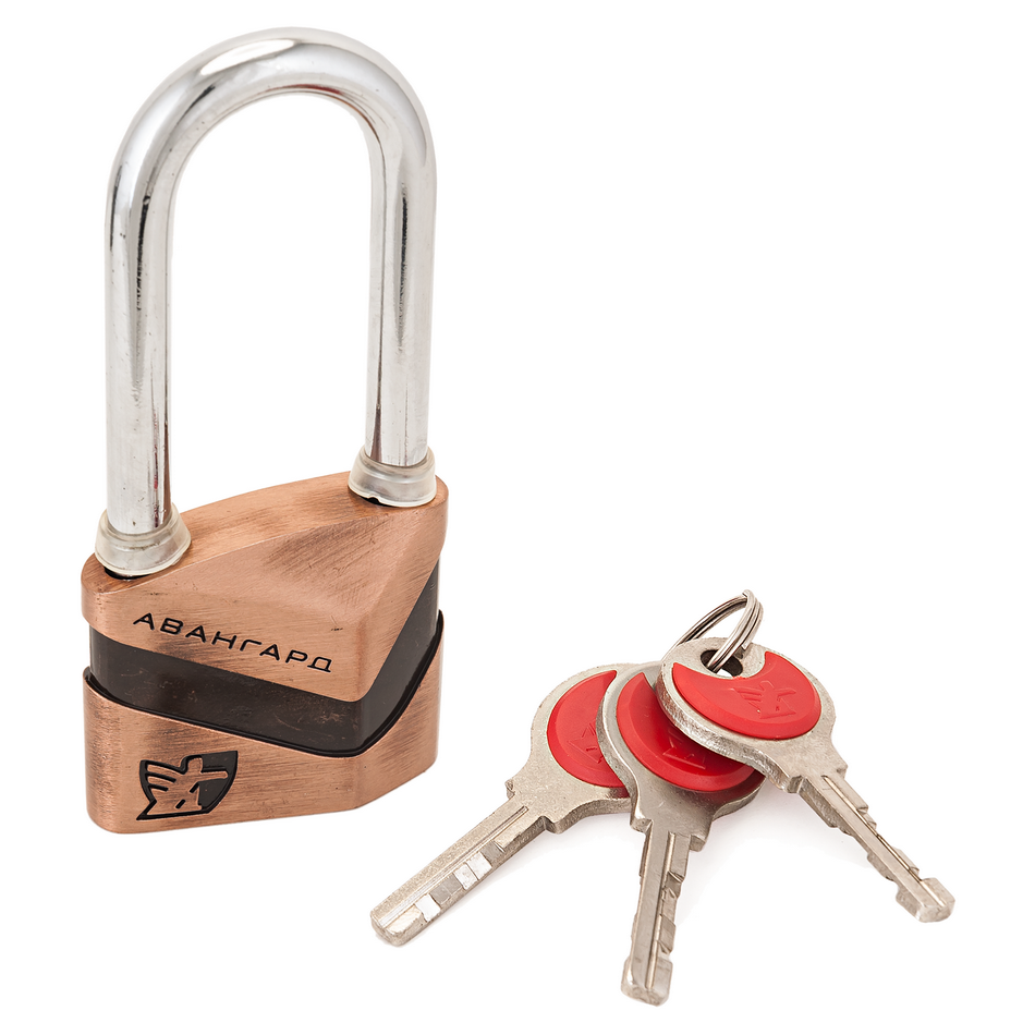 Авангард - стильные навесные замки. Замок навесной, общего применения. Корпус - алюминиевый сплав, гальваническое покрытие, дужка - сталь. Ширина основания корпуса - 50мм, диаметр дужки 8мм. Дисковый механизм секрета, с защитой от высверливания. Материал механизма - латунь. 3 ключа