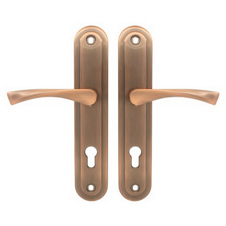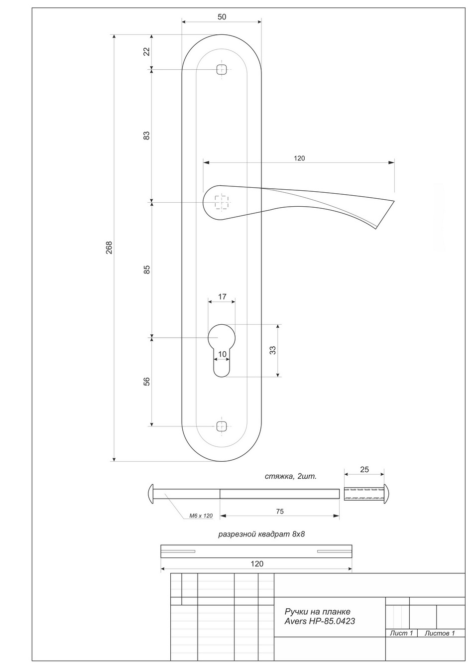 Ручка на планке под цилиндровый механизм. Материал - планка сталь, ручки алюминий, гальваническое покрытие. Межосевое расстояние - 85 мм. Размеры планки - 268х50 мм, длина ручки - 125 мм. В комплект входят 2 винтовые стяжки М6х60-80 мм и неразрезной квадрат 8х8 мм длиной 120 мм