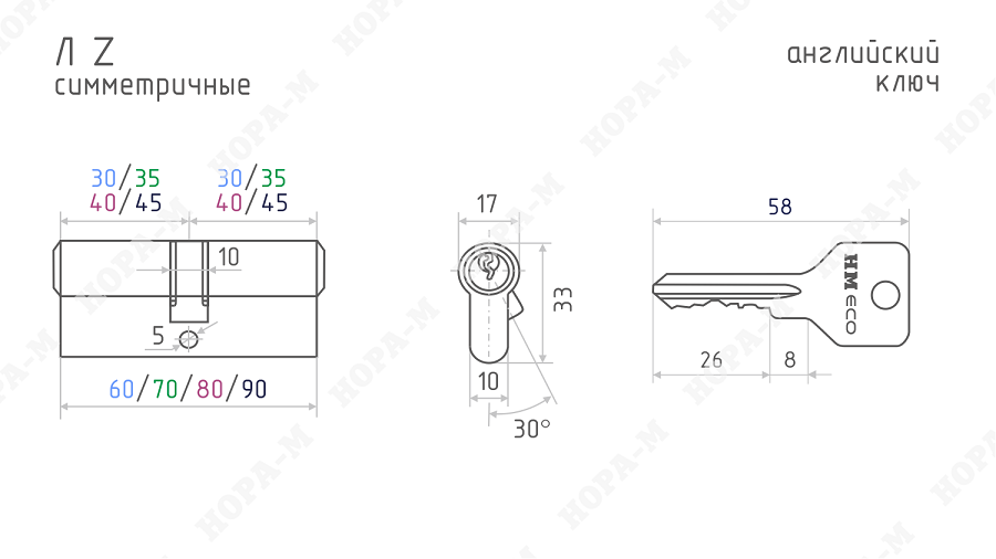 Нора М Цилиндр.механизм ECO Z Л-80(40/40) хром анг.кл/ключ 5к
