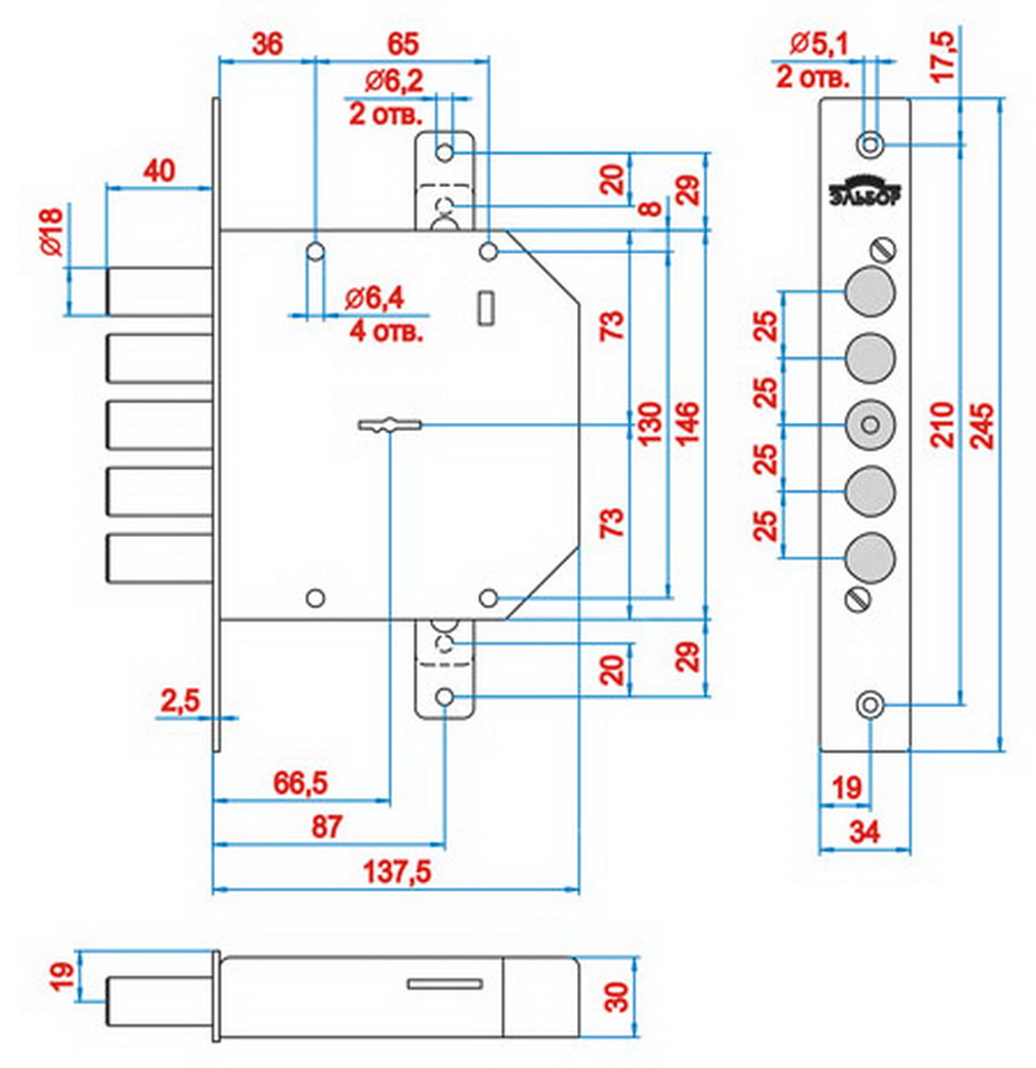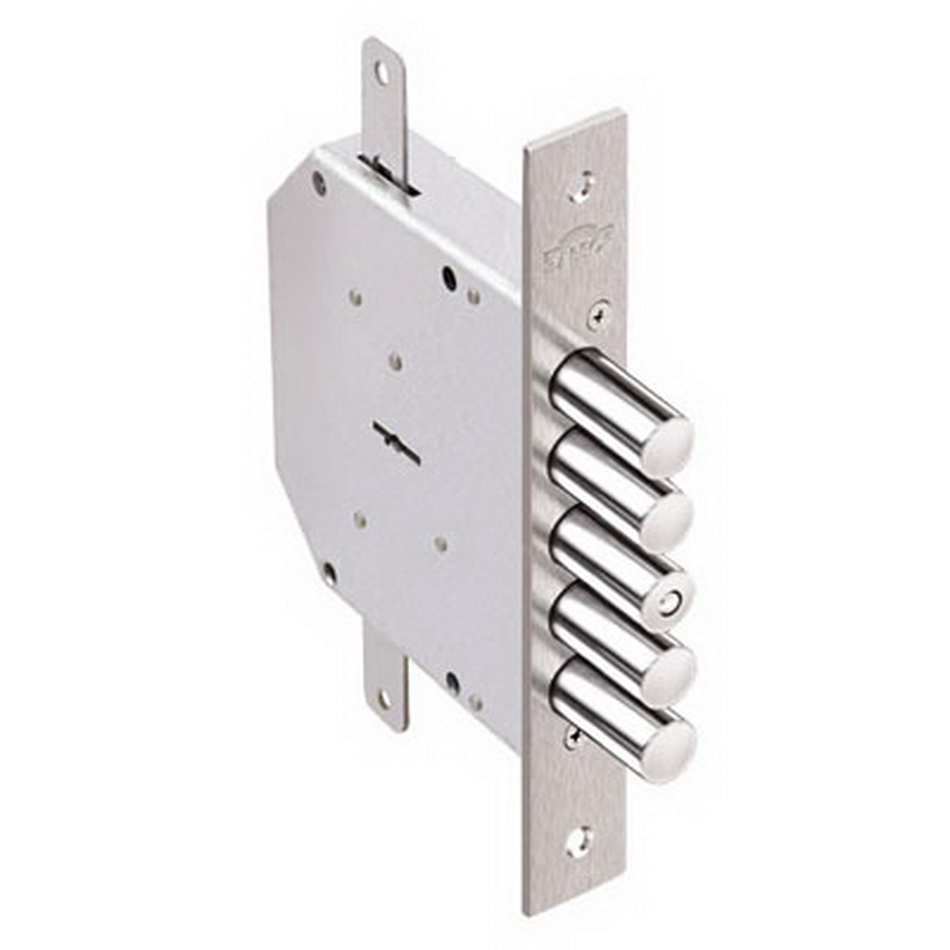 Замок врезной сувальдный с тягами. Предназначен для металлических дверей. Замок имеет засов из пяти цилиндрических ригелей диаметром 18 мм, с максимальным вылетом 40 мм, и тяги с вылетом 20 мм. Удаление ключевого отверстия 68 мм. Количество оборотов ключа - 4. Габариты замка - 137,5х146х30 мм. Комплектация - 5 ключей.