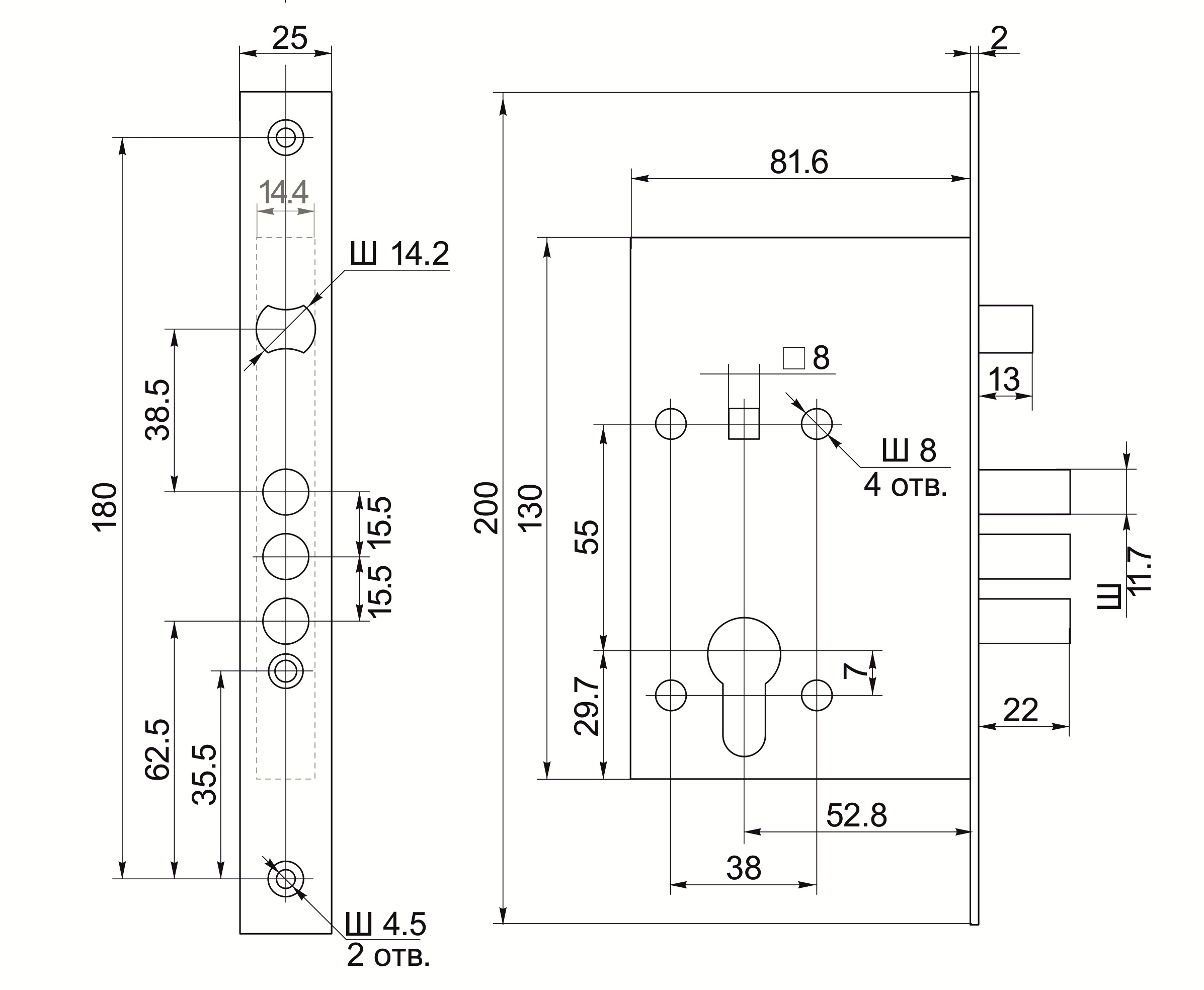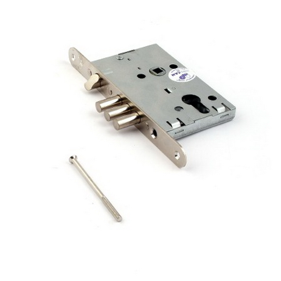 Замок сертифицирован как противопожарный. Замок врезной цилиндровый с защелкой и фалевыми ручками. Предназначен для входных и внутренних дверей толщиной 40-50 мм жилых домов, квартир, торговых и конторских помещений. Замок универсальный, его можно устанавливать как в правые, так и в левые двери, переустановив защелку. Возможно использование замка с цилиндровым механизмом длиной 70 мм для установки в металлические двери. Межцентровое расстояние 55 мм. Дверь может быть закрыта на защелку и открыта с помощью фалевой ручки при открытом засове замка. Изготавливается с засовом из трех стальных стержней круглого сечения. Покрытие корпуса — цинковое. Покрытие лицевой и ответной планок — никелевое. Стальная защелка. Фурнитура для замка: РФ55, РФ34 упаковка - пакет тип механизма - цилиндровый м/о расстояние — 55 мм вылет ригелей — 22 мм диаметр ригеля — 10,7 мм габаритные размеры 130х82х18.