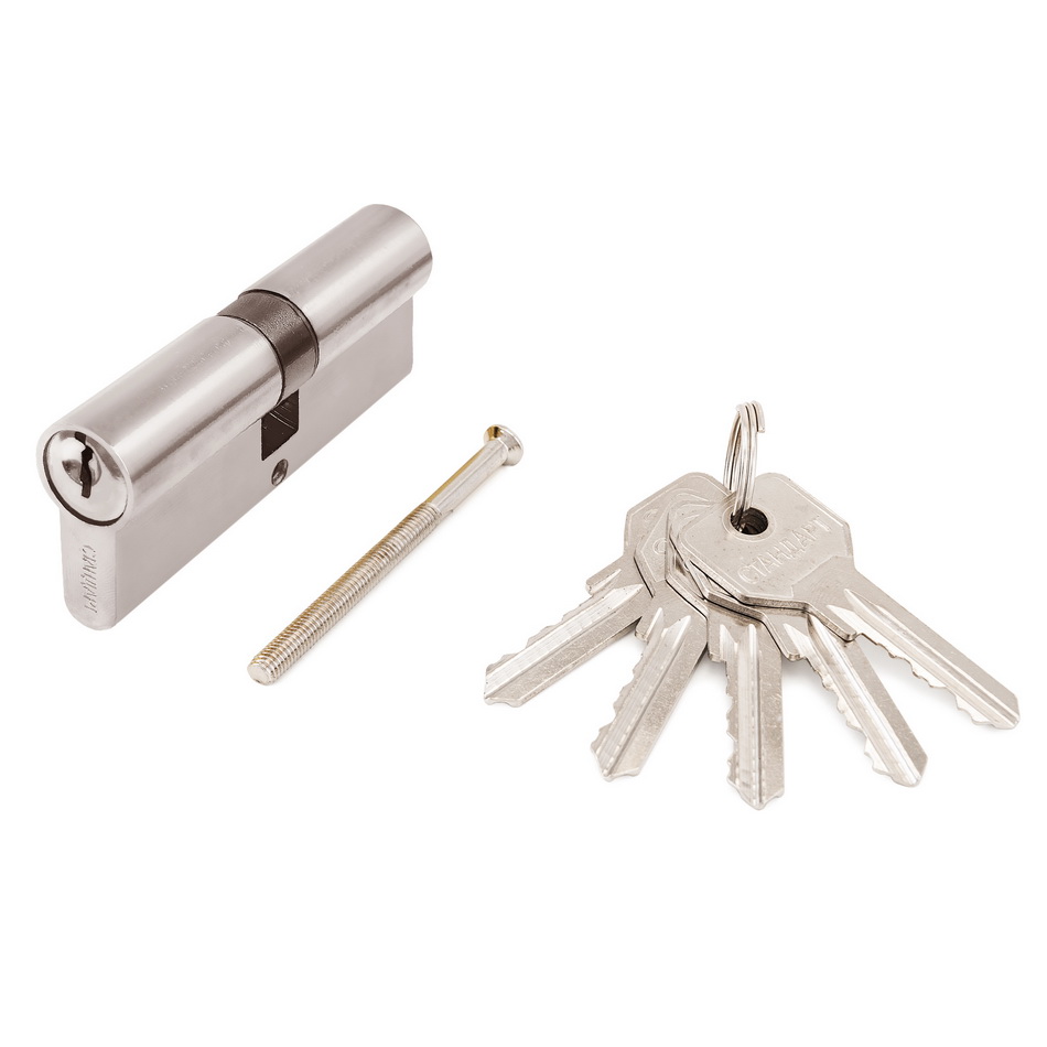 Механизм цилиндровый для врезных замков. Европрофиль. Английский ключ. Материал цилиндра - цинковый сплав. Ключ-ключ. Выступающий на 30 градусов из плоскости механизма кулачок защищает цилиндр от выбивания из двери. Длина механизма - 90(40x10x40)мм.