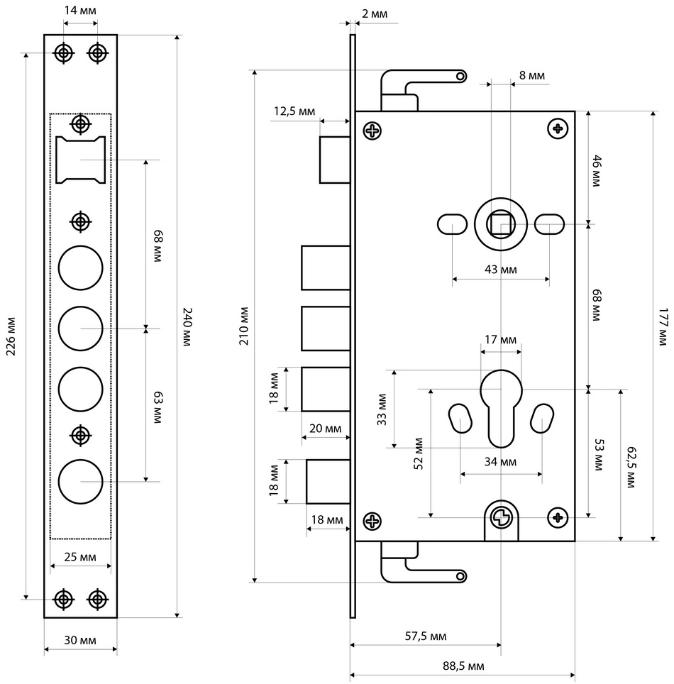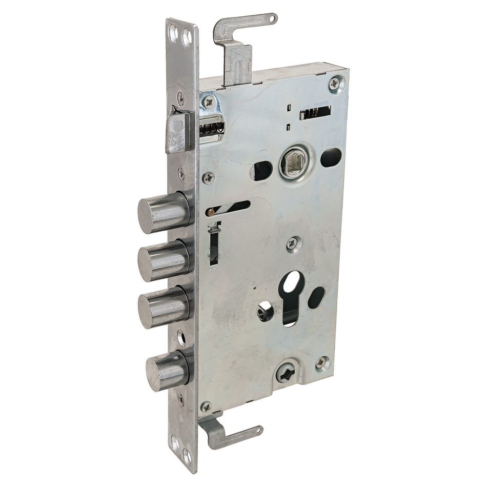 Замок врезной цилиндровый с защелкой и задвижкой, без механизма секрета. Предназначен для установки в китайские металлические двери, в качестве основного замка. Реверсивная защелка позволяет устанавливать замок на правые и левые двери. Три цилиндрических стальных ригеля. 3 точки запирания. Корпус замка - сталь, толщиной 0,9мм. Удаление ключевого отверстия 60мм. Межосевое расстояние 68мм. Расстояние от центра механизма секрета до задвижки 53мм. Ширина корпуса 88,5мм позволяет устанавливать изделие в двери с широким и узким "карманом" для замка.Цвет торцевой планки - хром, ширина 30мм.