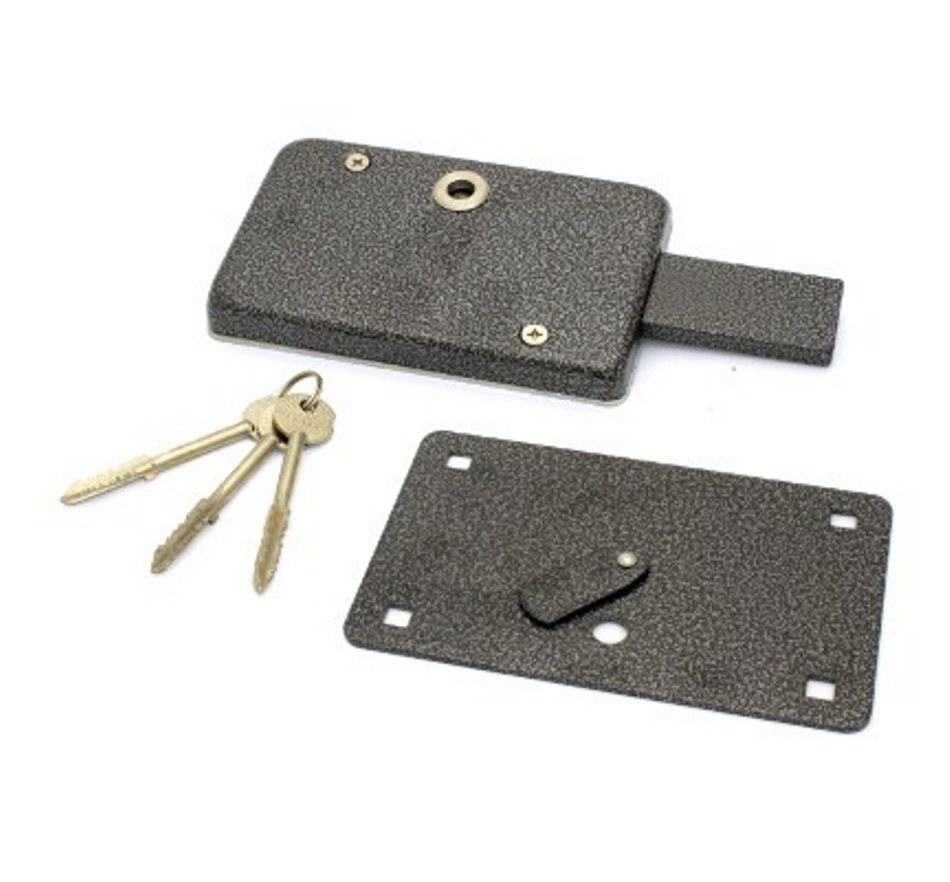 Замок накладной, цилиндровый под крест.ключ, для установки на металлические двери. Засов из прямоугольного ригеля размерами (ширина-высота) 12-40 мм, с максимальным вылетом 75 мм. Удаление ключевого отверстия - 90 мм. Габариты замка -255x110x85. Комплектация - 3 крестовых ключа, внешняя накладка, закрывающая весь корпус замка.