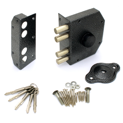 Замок накладной, цилиндровый под крест.ключ, с вертушкой. Предназначен для установки на металлические двери. Засов из четырех цилиндрических ригелей диаметром 18 мм, с максимальным вылетом 38 мм. Удаление ключевого отверстия - 60 мм. Габариты замка - 128х158х30 мм. Комплектация - 5 крестовых ключей, запорная коробка. Изнутри замок закрывается вертушкой.
