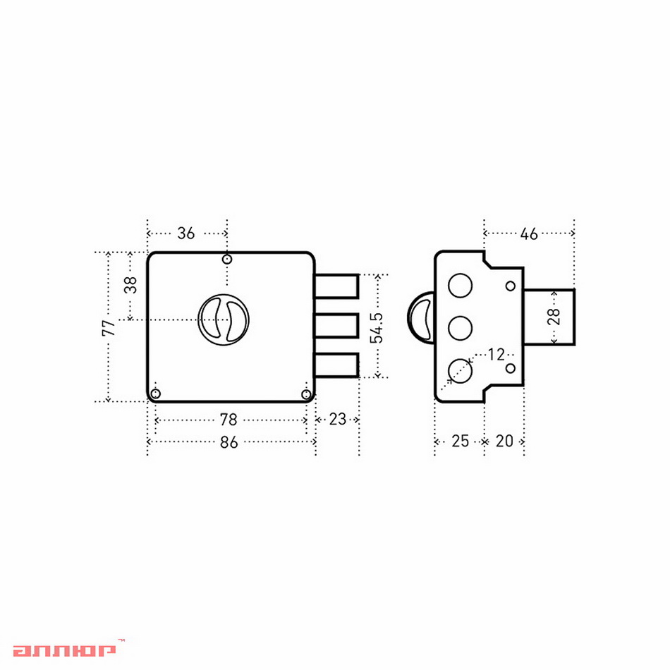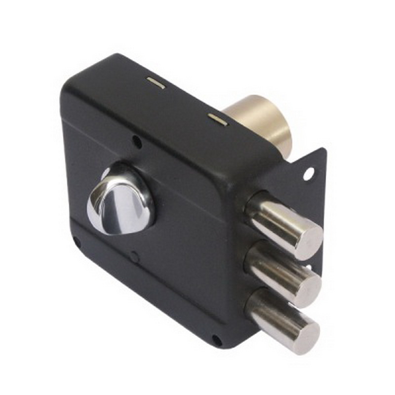 Замок накладной цилиндровый с вертушкой. Предназначен для установки на деревянные двери. Засов из трех цилиндрических ригелей диаметром 12 мм, с максимальным вылетом 22 мм. Удаление ключевого отверстия - 50 мм. Габариты замка - 86х77х25 мм. Комплектация - 6 ключей, запорная планка, накладка. Механизм замка под англ.ключ, идет совместно с корпусом. Закрывание и открывание замка изнутри производится вертушкой, снаружи ключом