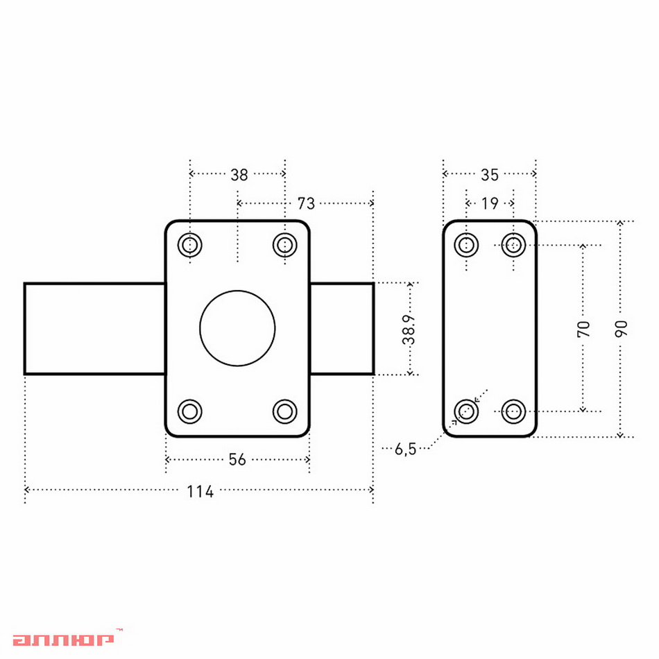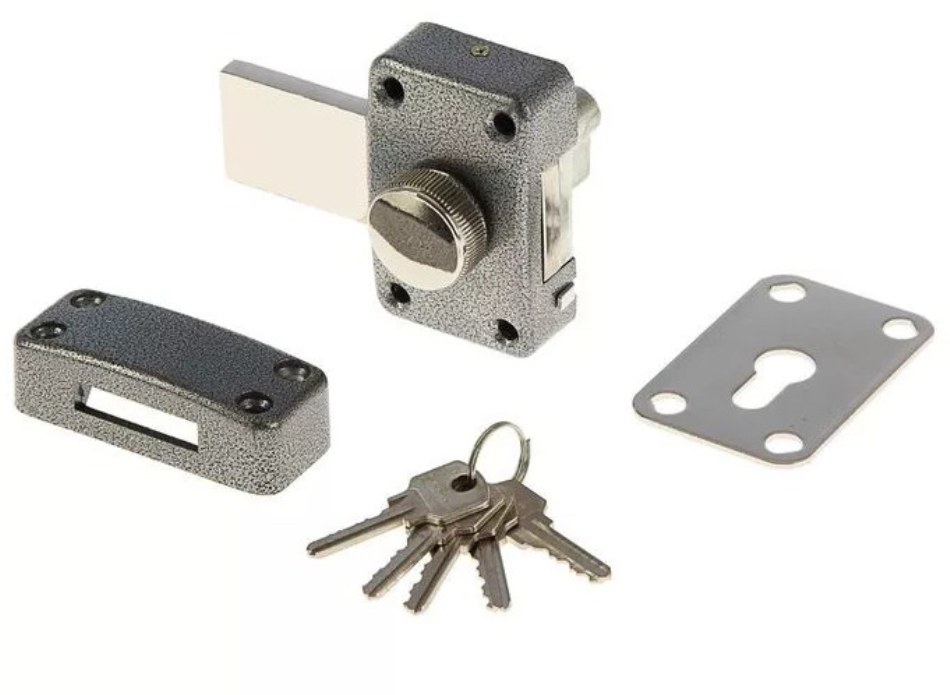 Замок накладной цилиндровый с вертушкой. Предназначен для установки на деревянные двери. Засов - цельный прямоугольный стальной ригель, общей длиной 114мм. Габариты корпуса замка - 90х56мм. Комплектация - 5 ключей, запорная планка со стяжками, наружная накладка со стяжными болтами. Механизм замка под англ.ключ, идет совместно с корпусом. Закрывание и открывание замка изнутри производится вертушкой, снаружи ключом. Имеет фиксатор, которым можно полностью блокировать замок. Совпадает по посадочным отверстиям с замком ELP Казань.