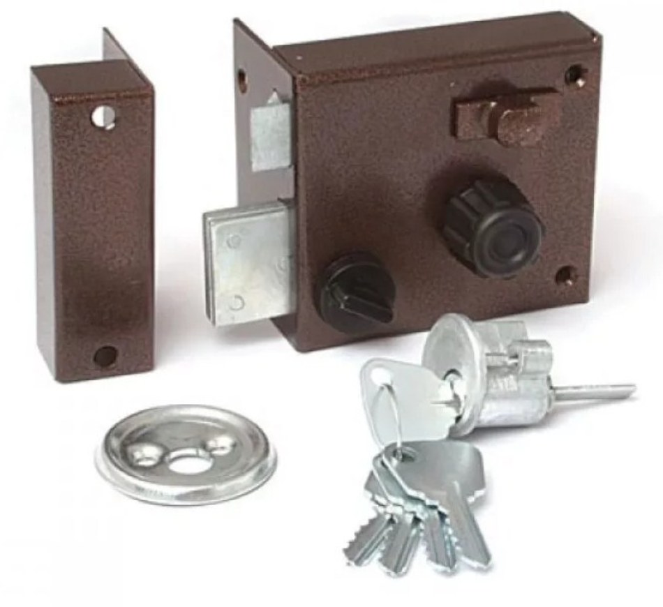 Замок накладной цилиндровый с защелкой, вертушкой и фиксатором. Предназначен для установки на деревянные двери. Засов прямоугольного сечения 8х35 мм, с максимальным вылетом 24 мм. Удаление ключевого отверстия - 58 мм. Габариты замка - 100х90х48 мм. Комплектация - 5 ключей, запорная коробка, накладка.