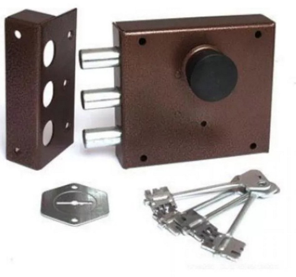 Замок накладной сувальдный с вертушкой. Предназначен для установки на металлические двери. Засов из трех цилиндрических ригелей диаметром 16 мм, с максимальным вылетом 30 мм. Удаление ключевого отверстия - 70 мм. Габариты замка - 120х135х28 мм. Комплектация - 4 ключей, торцевая планка, накладка. Изнутри закрывается с помощью вертушки.