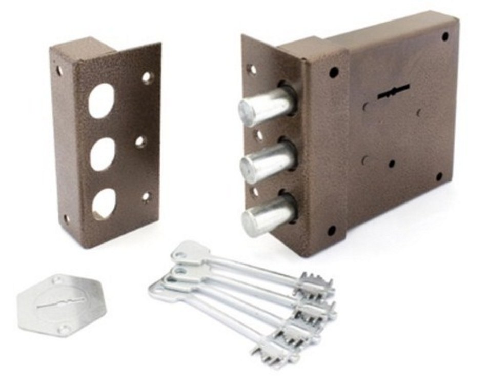 Замок накладной сувальдный. Предназначен для установки на металлические двери. Засов из трех цилиндрических ригелей диаметром 16 мм, с максимальным вылетом 30 мм. Удаление ключевого отверстия - 70 мм. Габариты замка - 120х135х28 мм. Комплектация - 4 ключей, торцевая планка, накладка