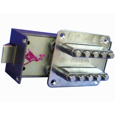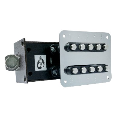 Замок-защелка кодовый. Предназначен для установки в металлические и деревянные двери толщиной от 36 до 45 мм. Засов-защелка размерами 20х20 мм, с максимальным вылетом 15 мм. Габариты замка - 160х58х35 мм. Комплектация - накладки, запорная планка. Принцип работы: для отпирания замка снаружи необходимо одновременно нажать все закодированные кнопки; изнутри замок отпирается с помощью ручки. Количество возможных кодов - более 1000.