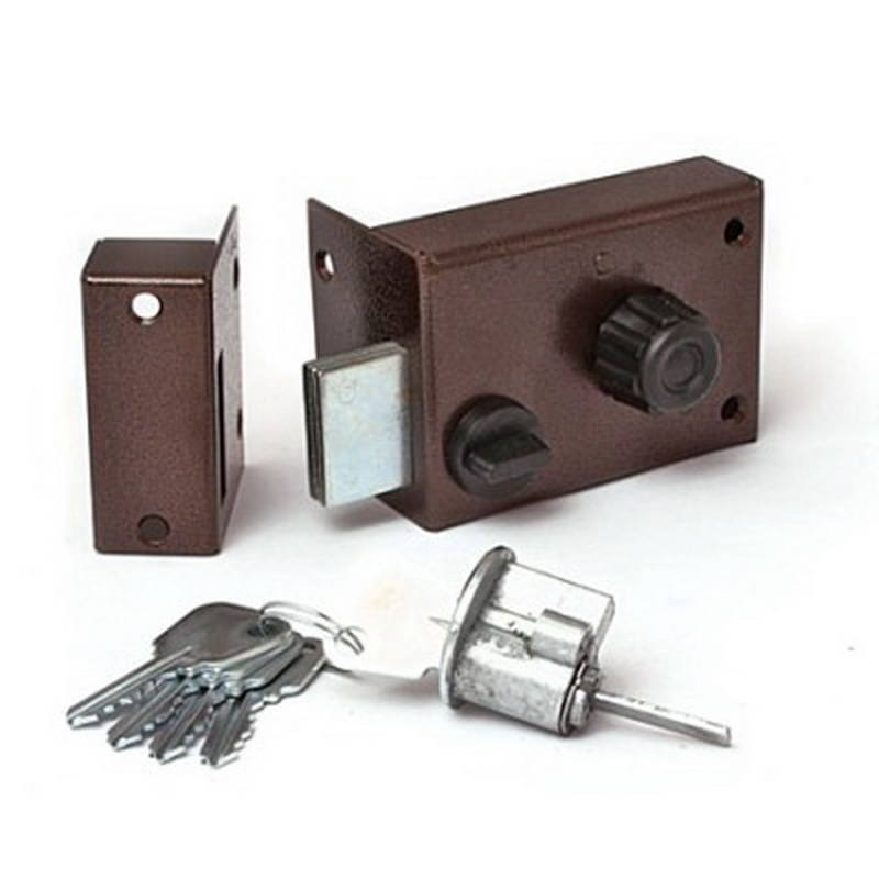 Замок накладной цилиндровый с вертушкой и фиксатором. Предназначен для установки на деревянные двери. Засов прямоугольного сечения 8х35 мм, с максимальным вылетом 24 мм. Удаление ключевого отверстия - 58 мм. Габариты замка - 100х70х48 мм. Комплектация - 5 ключей, запорная коробка, накладка.