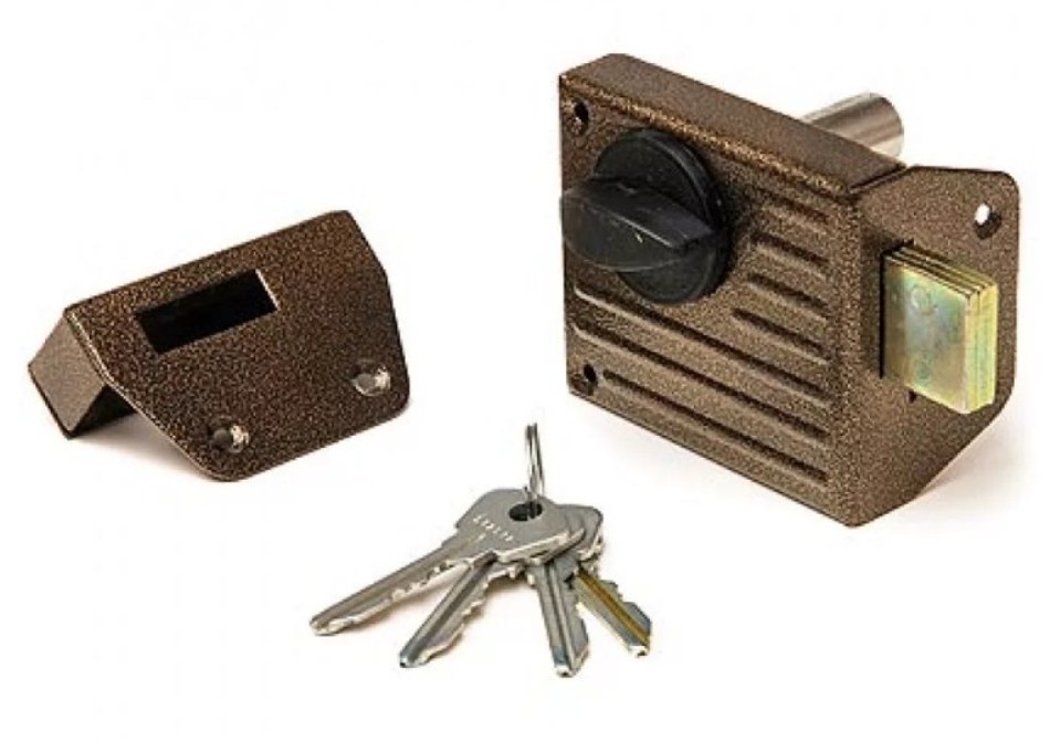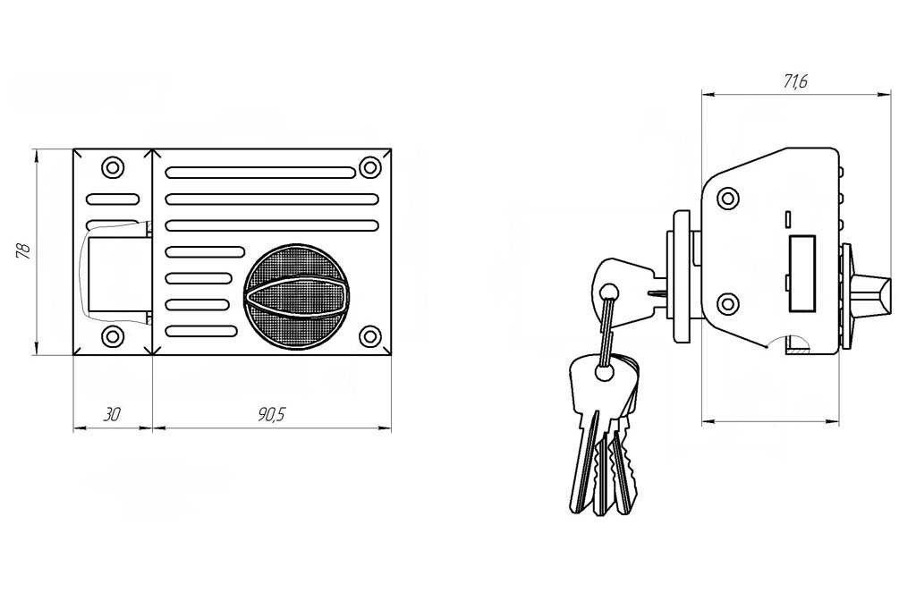 Замок накладной цилиндровый с вертушкой. Предназначен для установки на деревянные двери. Засов прямоугольного сечения размерами 9х28, с максимальным вылетом 25 мм. Удаление ключевого отверстия - 55 мм. Габариты замка - 90,5х78х21 мм. Комплектация - 4 ключа, запорная планка, накладка. Закрывание и открывание замка изнутри производится ручкой, снаружи ключом.