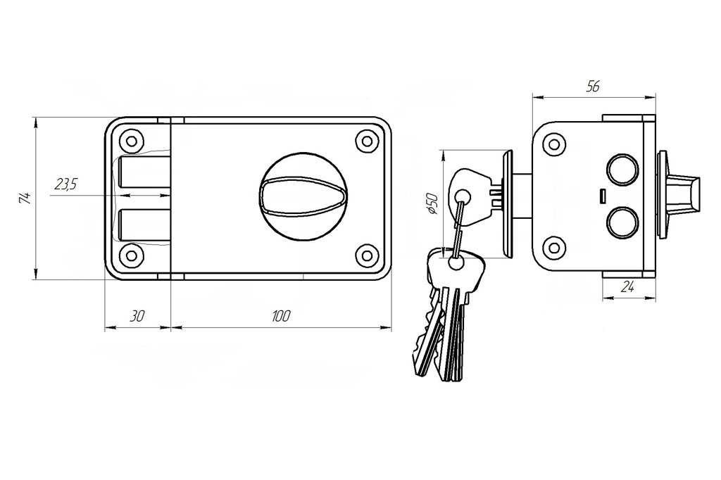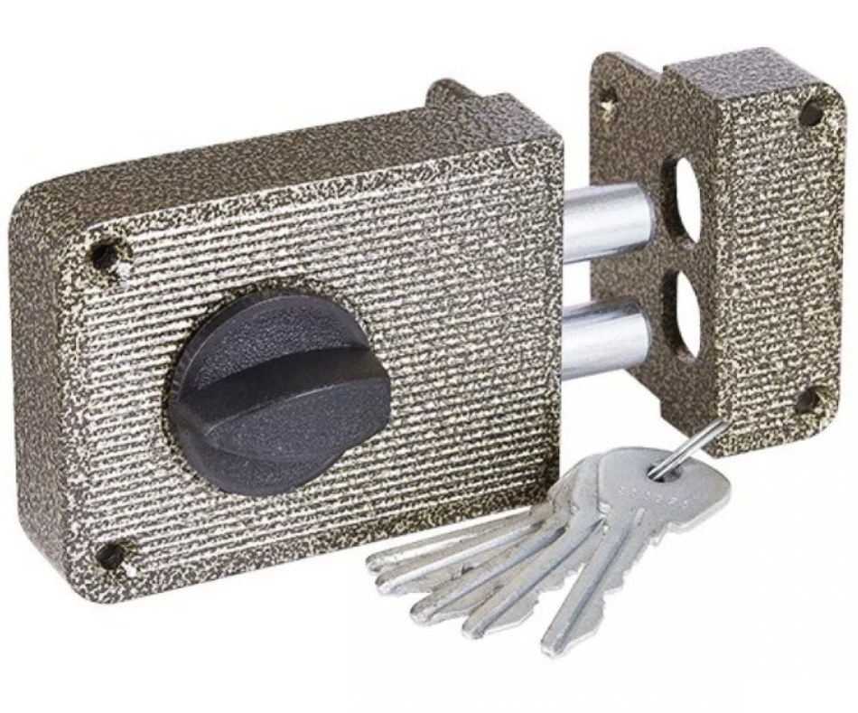 Замок накладной цилиндровый с вертушкой. Предназначен для установки на деревянные двери. Засов из двух цилиндрических ригелей диаметром 14 мм, с максимальным вылетом 25 мм. Удаление ключевого отверстия - 60 мм. Габариты замка - 100х75х24,5 мм. Комплектация - 4 ключей, запорная планка, накладка. Закрывание и открывание замка изнутри производится ручкой, снаружи ключом. Корпус из ударопрочного пластика со стальной пластиной