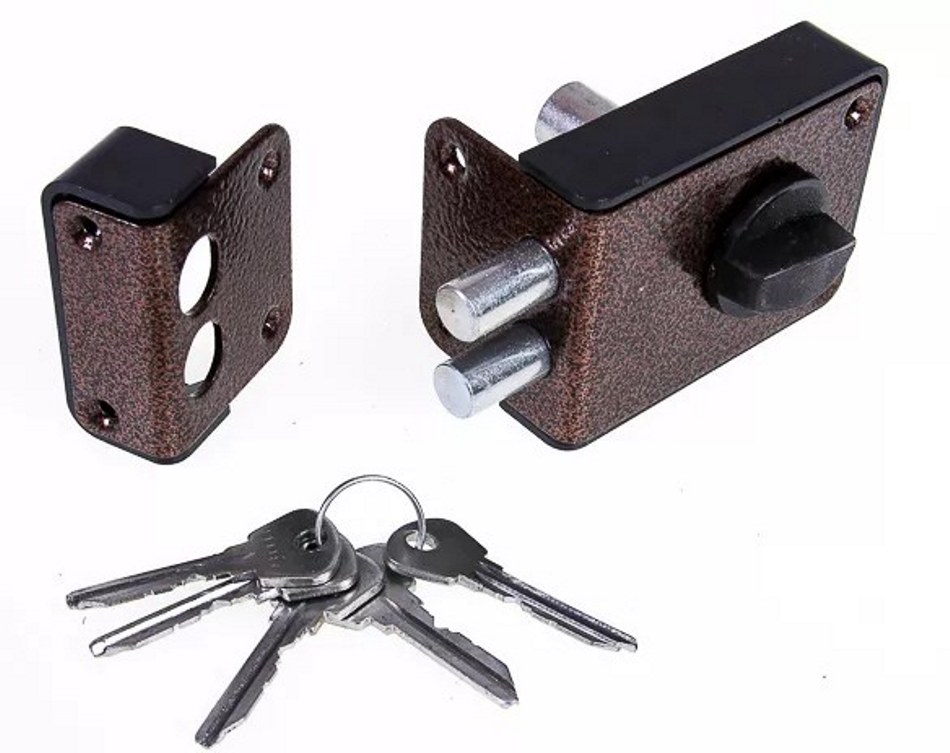 Замок накладной цилиндровый с вертушкой. Предназначен для установки на деревянные двери. Засов из двух цилиндрических ригелей диаметром 14 мм, с максимальным вылетом 25 мм. Удаление ключевого отверстия - 60 мм. Габариты замка - 100х75х24,5 мм. Комплектация - 4 ключей, запорная планка, накладка. Закрывание и открывание замка изнутри производится ручкой, снаружи ключом. Корпус из ударопрочного пластика со стальной пластиной