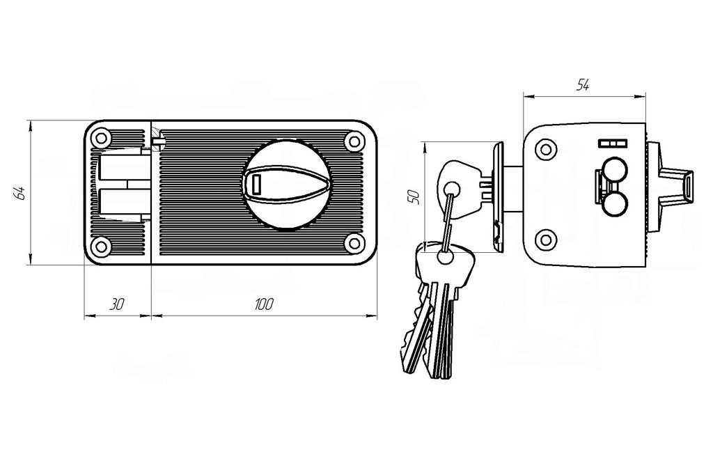 Замок накладной цилиндровый с вертушкой. Предназначен для установки на деревянные двери. Засов из двух цилиндрических ригелей диаметром 11 мм, с максимальным вылетом 25 мм. Удаление ключевого отверстия - 60 мм. Габариты замка - 100х64х22,5 мм. Комплектация - 5 ключей, запорная планка, накладка. Закрывание и открывание замка изнутри производится ручкой, снаружи ключом. Есть функция автоматического запирания.