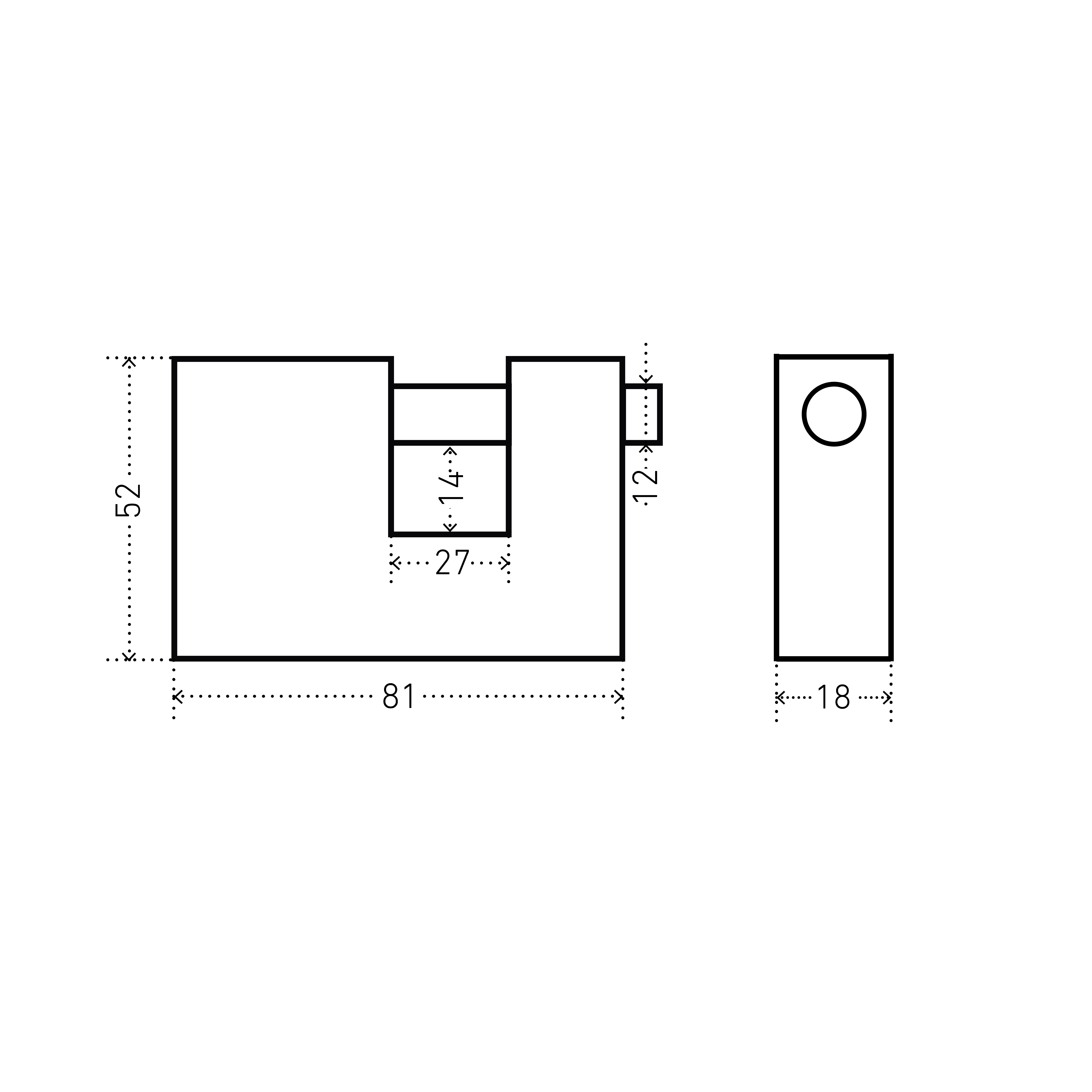 Ширина основания корпуса - 81мм, диаметр дужки 12мм.