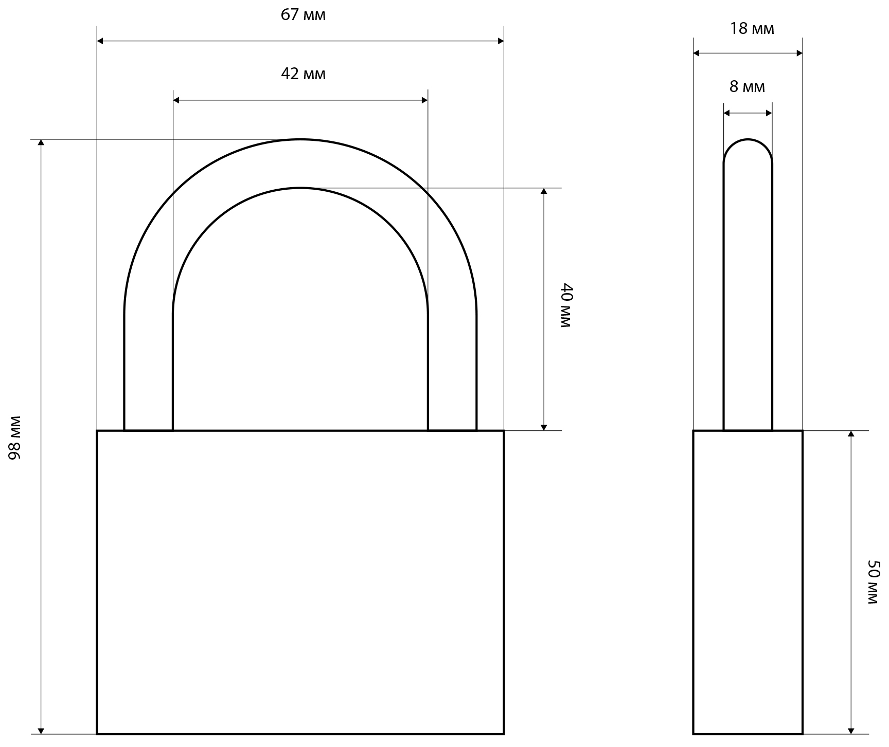 амок навесной цилиндровый общего применения. Материал корпуса - чугун. Закаленная стальная дужка диаметром 8 мм; проем дужки - 40 мм по высоте и 41 мм по ширине. Габариты корпуса - 67,9х50,5 мм. Комплектуется 3 английскими ключами. Замок имеет функцию автоматического закрывания