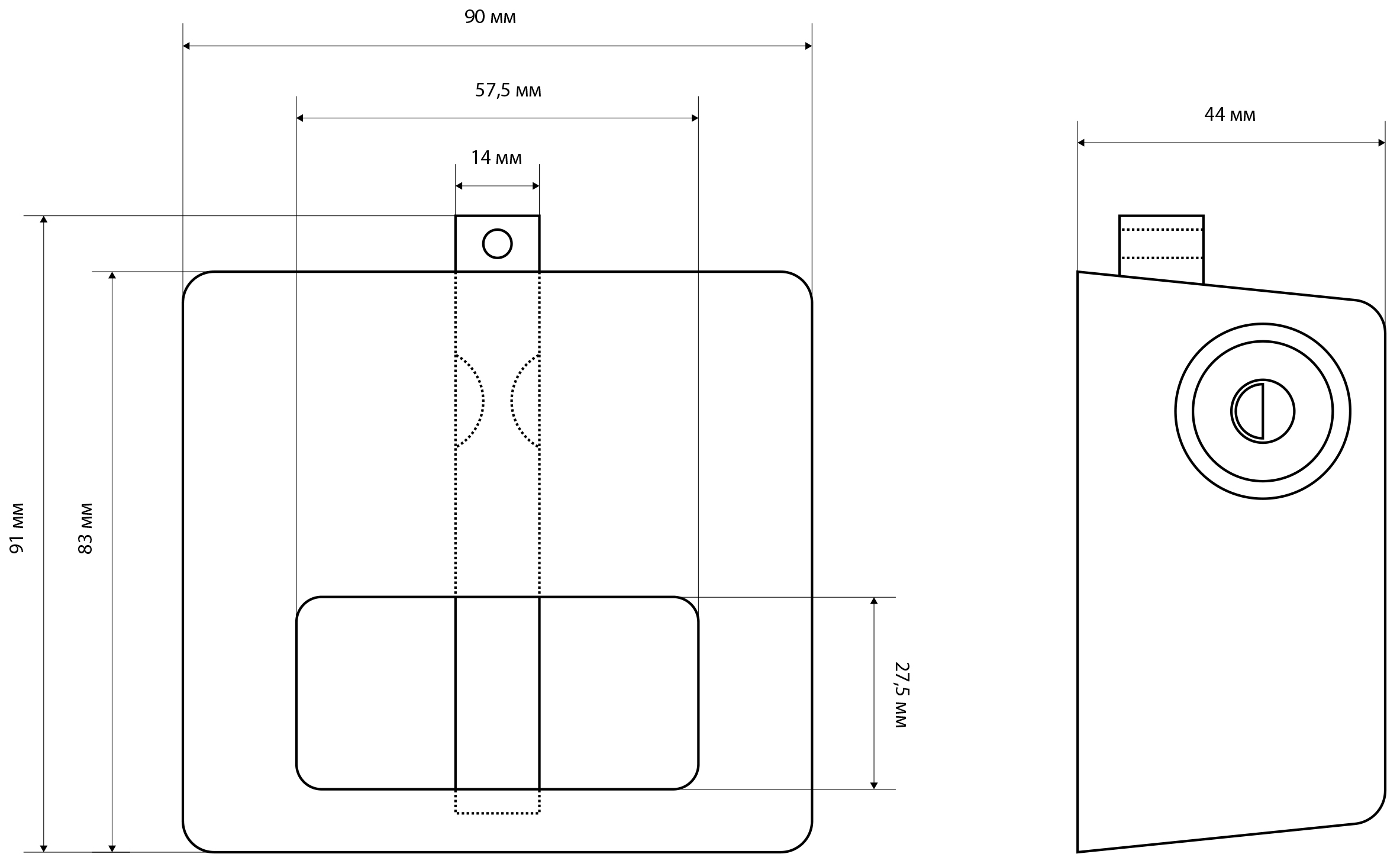 Ширина основания корпуса - 89мм, диаметр дужки - 14мм.