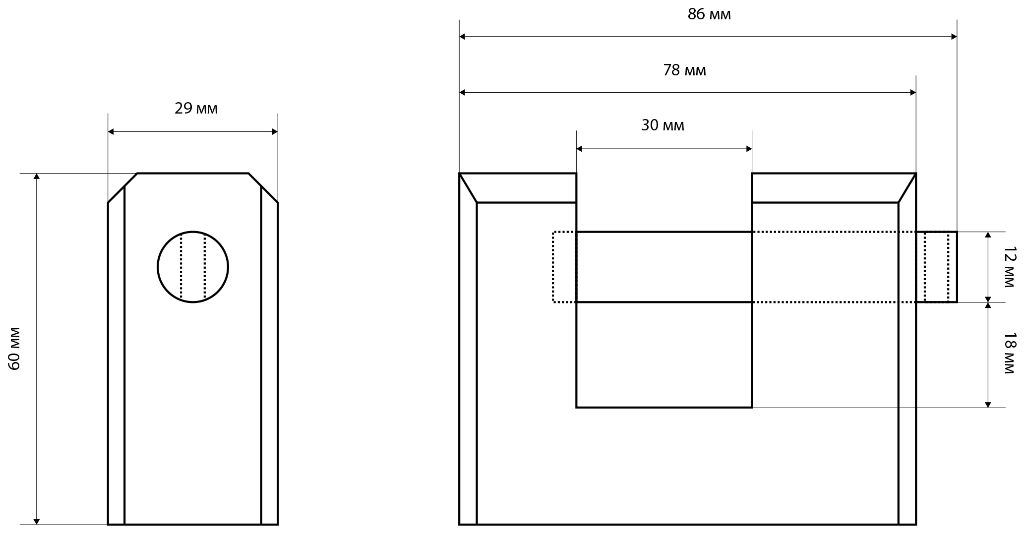 Ширина основания корпуса - 79мм, диаметр дужки - 12мм.