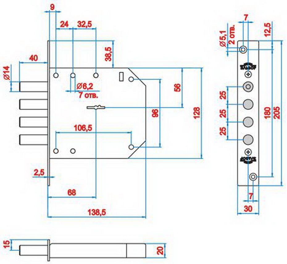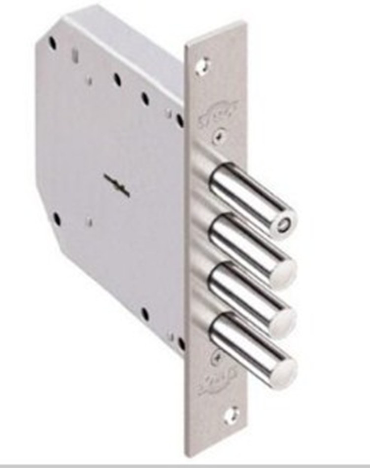 Замок врезной сувальдный для металлических дверей. Засов из четырех цилиндрических ригелей диаметром 14 мм, с максимальным вылетом 40 мм. Удаление ключевого отверстия 68 мм. Количество оборотов ключа - 4. Габариты замка - 138,5х128х20 мм. Комплектация - 5 ключей, съемная торцевая планка, комплект накладок. В одном из ригелей расположен закаленный стальной стержень, обеспечивающий надежную защиту от перепиливания. Защита от взлома, высверливания, выдавливания.