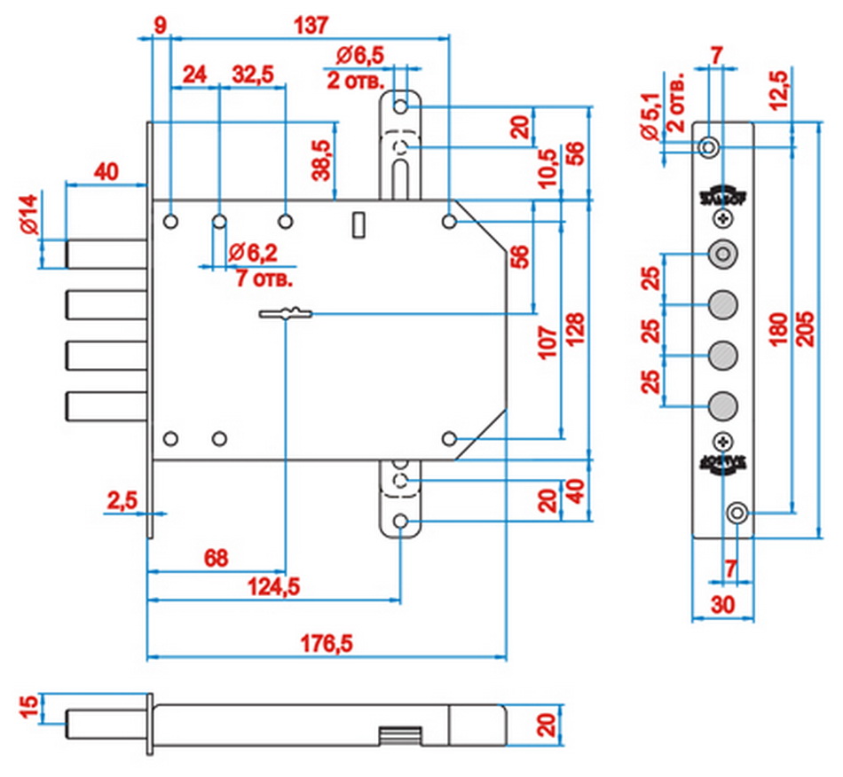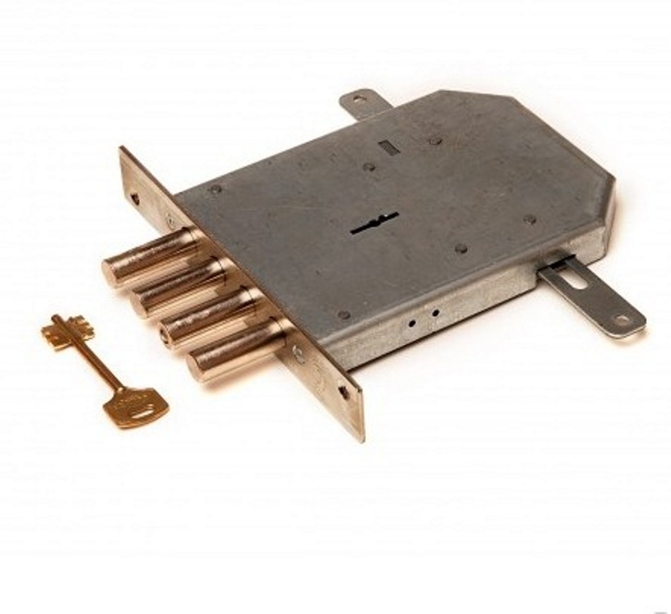 Замок врезной сувальдный с тягами для металлических дверей. Замок имеет засов из четырех цилиндрических ригелей диаметром 14 мм, с максимальным вылетом 40 мм, и вертикальные тяги с вылетом 20 мм. Удаление ключевого отверстия 68 мм. Количество оборотов ключа - 4. Габариты замка - 138,5х128х20 мм. Комплектация - 5 ключей, съемная торцевая планка, комплект накладок. В одном из ригелей расположен закаленный стальной стержень, обеспечивающий надежную защиту от перепиливания. Защита от взлома, высверливания, выдавливания.