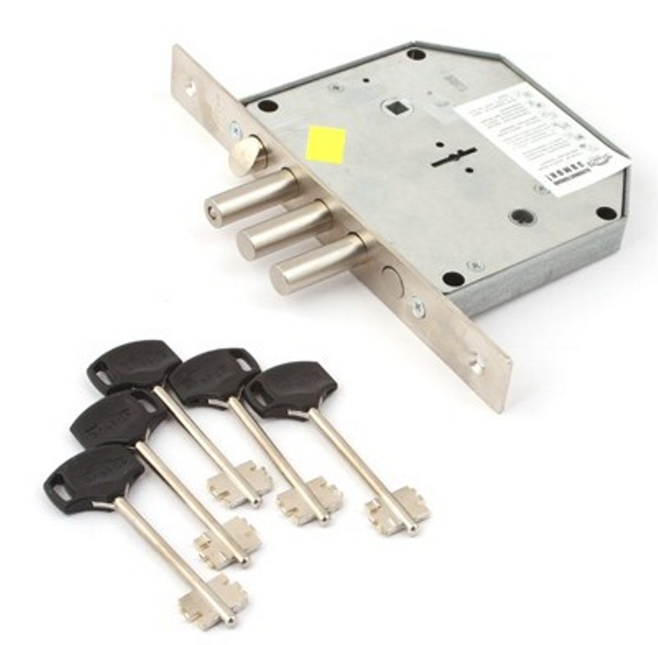 Замок врезной сувальдный с защелкой и задвижкой. Предназначен для металлических дверей. Замок имеет засов из четырех цилиндрических ригелей диаметром 14 мм, с максимальным вылетом 40,4 мм, защелку диаметром 16 мм и задвижку диаметром 14 мм и вылетом 21,5 мм. Удаление ключевого отверстия 68 мм. Межосевое расстояние 42 мм (до защелки) и 47 мм (до задвижки). Количество оборотов ключа - 4. Габариты замка - 137,5х152х20 мм. Комплектация - 5 ключей, съемная торцевая планка, комплект накладок. В одном из ригелей расположен закаленный стальной стержень, обеспечивающий надежную защиту от перепиливания. Защита от криминального и силового взлома, высверливания, выдавливания