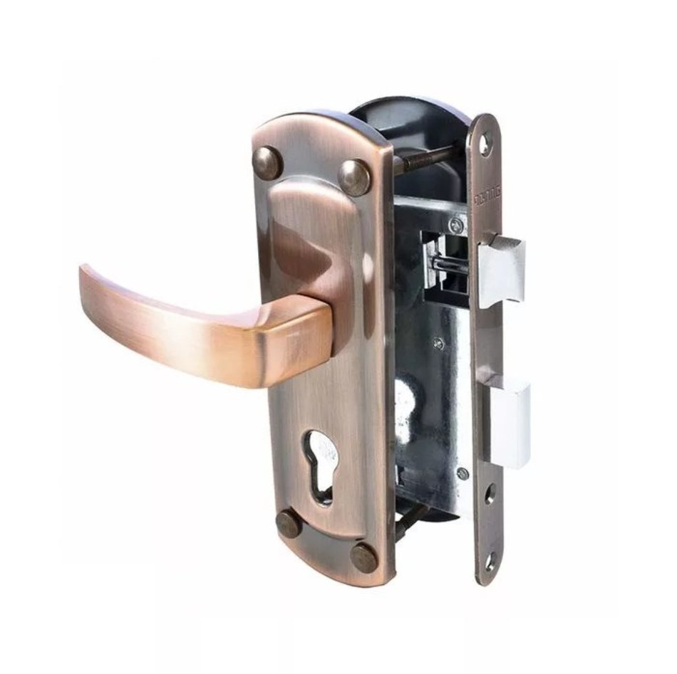 Врезной замок с ручками. Предназначен для установки в деревянные двери толщиной до 40 мм. Прямоугольный ригель, вылет 24 мм. Универсальная защелка. Корпус из оцинкованной стали. Межосевое расстояние - 58,5 мм. Удаление ключевого отверстия - 55 мм. Материал ручек — алюминиевый сплав , накладки — сталь. Многослойное гальваническое покрытие. Комплектация: замок, ручки, ответная планка, усиленные винтовые стяжки, цилиндровый механизм 70 мм.