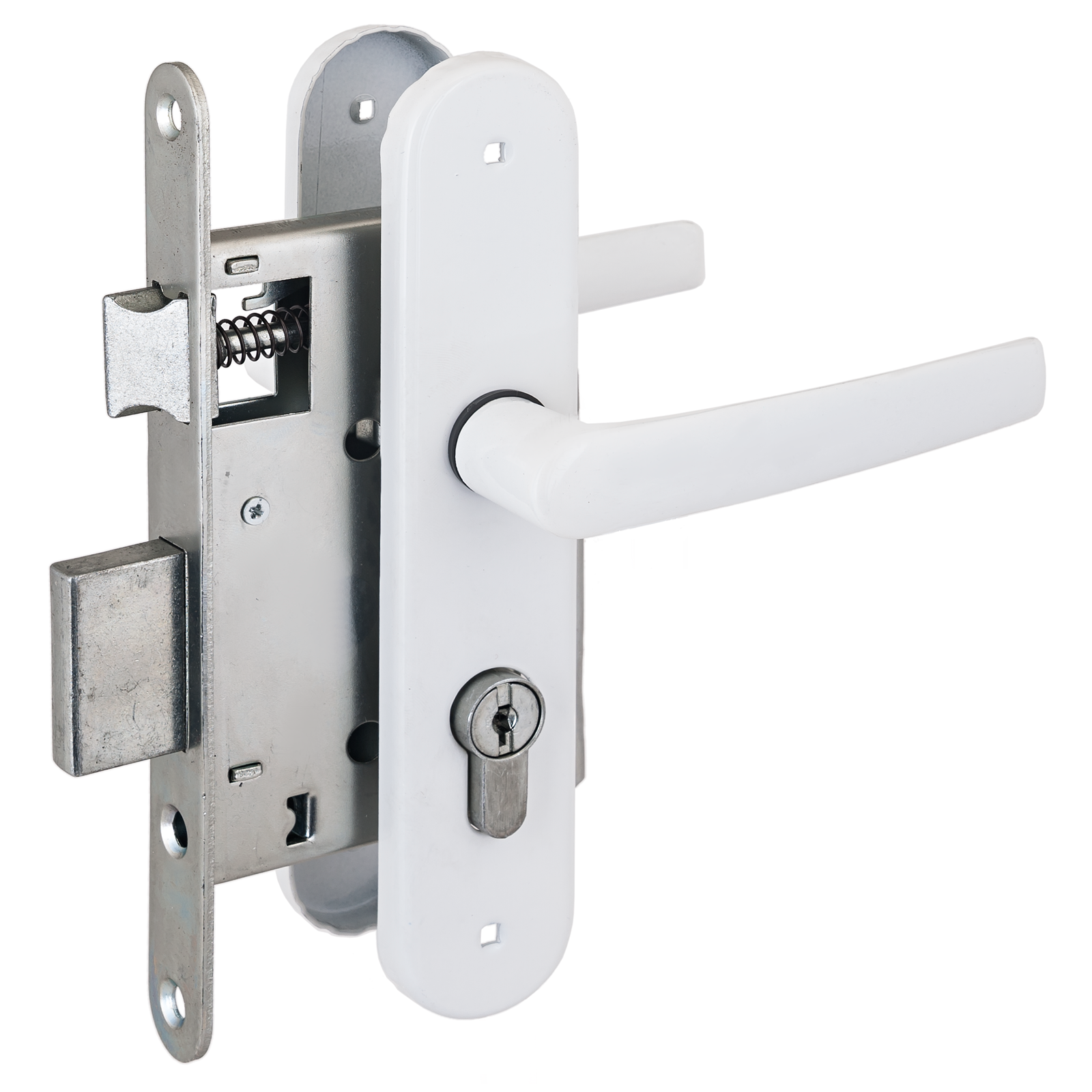 Замок врезной с ручками, цилиндровый. Предназначен для установки в деревянные двери толщиной 40-50мм, правого и левого открывания. Стальной оцинкованный корпус. Прямоугольный ригель из цинкового сплава, вылет 22мм. Межосевое расстояние 55мм. Удаление ключевого отверстия 55мм. Габаритный размер 85х130 мм. Ручки - алюминиевый сплав, покрытие - краска, без пружины, крепление - стяжками. Комплектуется цилиндровым механизмом 70мм с 4 ключами.