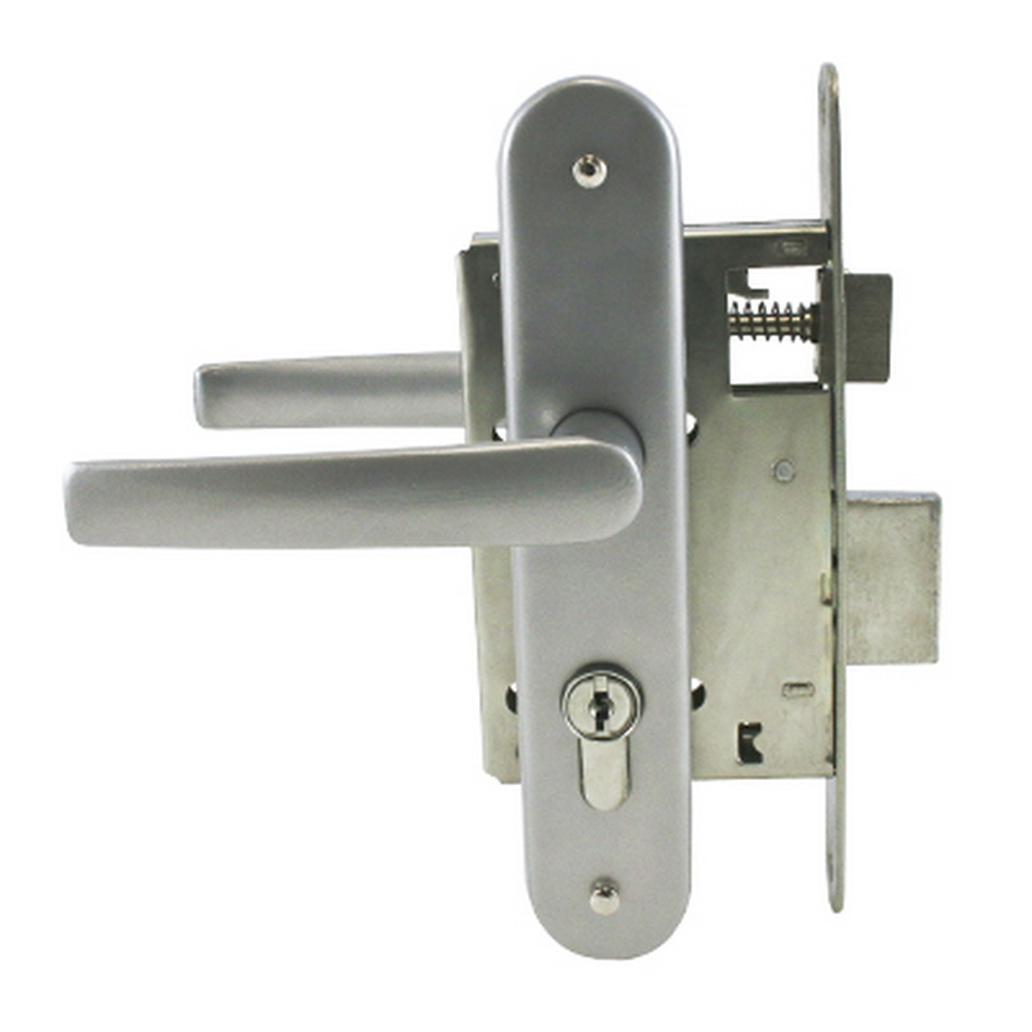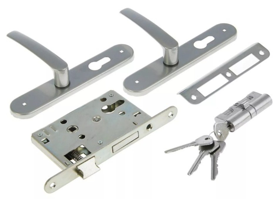 Замок врезной с ручками, цилиндровый. Предназначен для установки в деревянные двери толщиной 40-50мм, правого и левого открывания. Крепление ручек - стяжками (возможно шурупами). Стальной оцинкованный корпус. Прямоугольный ригель из цинкового сплава, вылет 22мм. Межосевое расстояние 55мм. Удаление ключевого отверстия 55мм. Габаритный размер 85х130 мм. Ручки - алюминиевый сплав, покрытие - краска, без пружины. Комплектуется цилиндровым механизмом 70мм с 4 ключами.