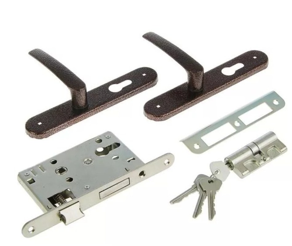 Замок врезной с ручками, цилиндровый. Предназначен для установки в деревянные двери толщиной 40-50мм, правого и левого открывания. Крепление ручек - стяжками или шурупами. Стальной оцинкованный корпус. Прямоугольный ригель из цинкового сплава, вылет 22мм. Межосевое расстояние 55мм. Удаление ключевого отверстия 55мм. Габаритный размер 85х130 мм. Ручки - алюминиевый сплав, покрытие - краска, без пружины. Комплектуется цилиндровым механизмом 70мм с 4 ключами.