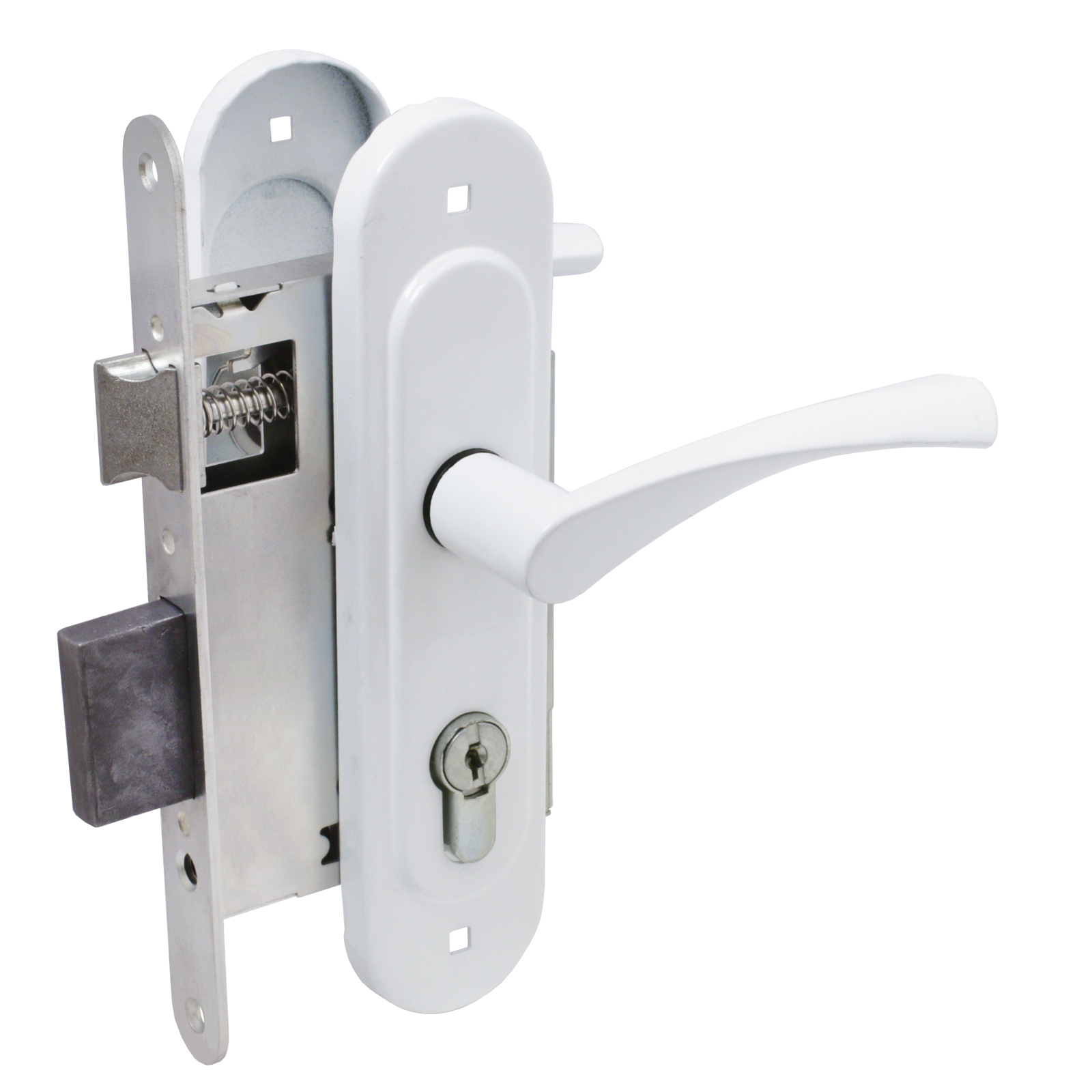 Замок врезной с ручками, цилиндровый. Предназначен для установки в деревянные двери толщиной 40-50мм, правого и левого открывания. Стальной оцинкованный корпус. Прямоугольный ригель из цинкового сплава, вылет 22мм. Межосевое расстояние 55мм. Удаление ключевого отверстия 55мм. Габаритный размер 85х130 мм. Ручки - сталь, алюминиевый сплав, покрытие - краска, крепление - стяжками. Комплектуется цилиндровым механизмом 70мм с 4 ключами. 15000 секретных комбинаций.