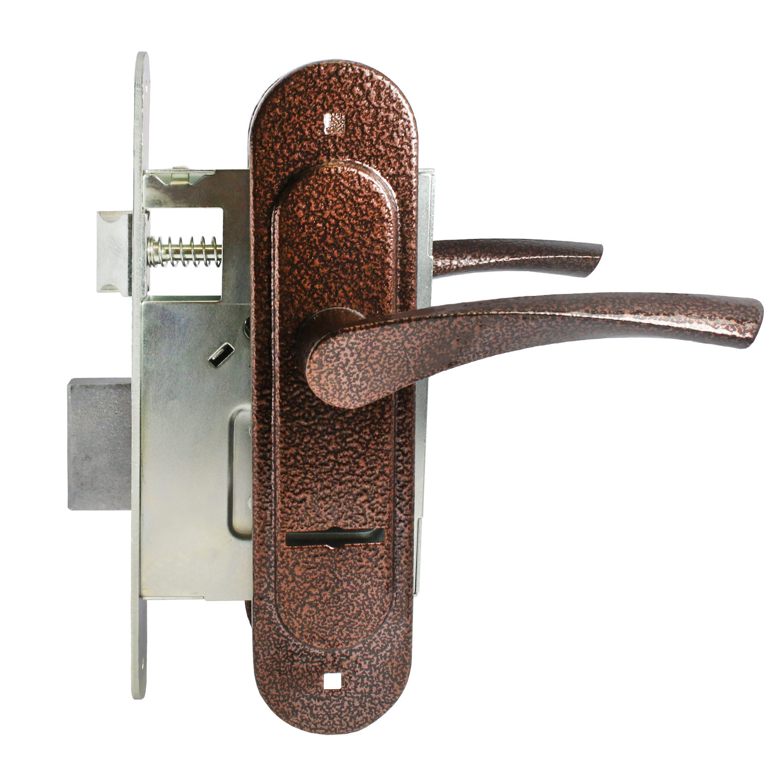 Замок врезной с подпружиненными ручками. Предназначен для установки в деревянные двери толщиной до 65 мм, правого и левого открывания. Стальной оцинкованный корпус, засов с вылетом 22мм. Межосевое расстояние 55мм. Удаление ключевого отверстия 55мм. Габаритный размер 130х85 мм. Ручки - сталь, алюминиевый сплав, покрытие - полимерная краска, крепление - стяжками. Сувальдный механизм запирания, 3 ключа в комплекте.