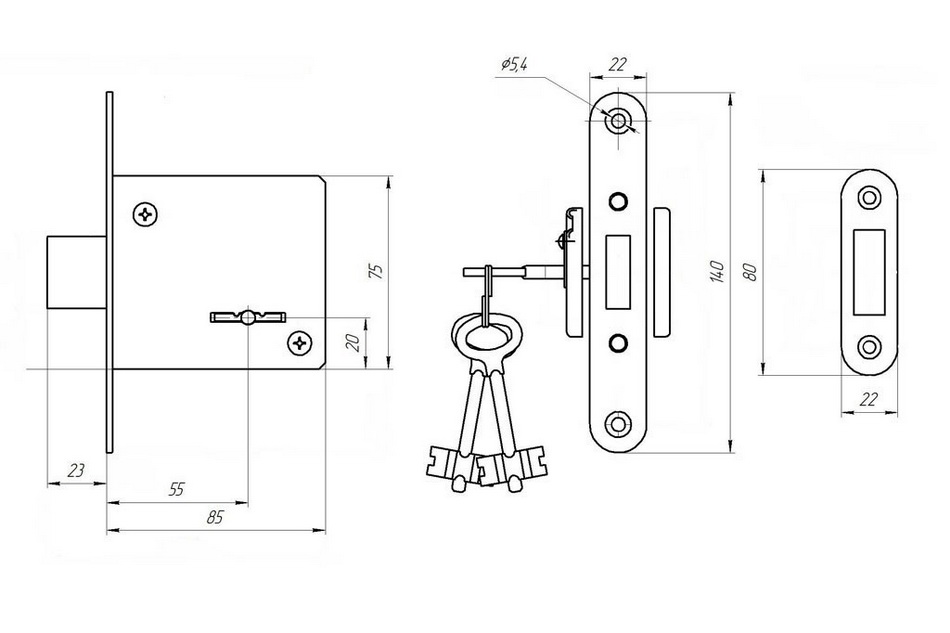 амок врезной сувальдный. Предназначен для установки в деревянные двери толщиной до 50 мм. Стальной оцинкованный корпус. Прямоугольный ригель, вылет 23мм. Удаление ключевого отверстия 55мм. Габаритные размеры 85х140х22 Комплектуется 5 ключами, запорной планкой, комплектом накладок и комплектом для крепежа.