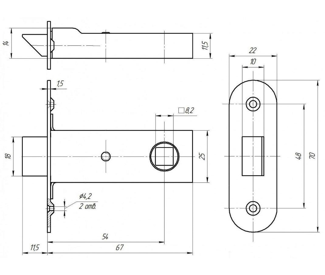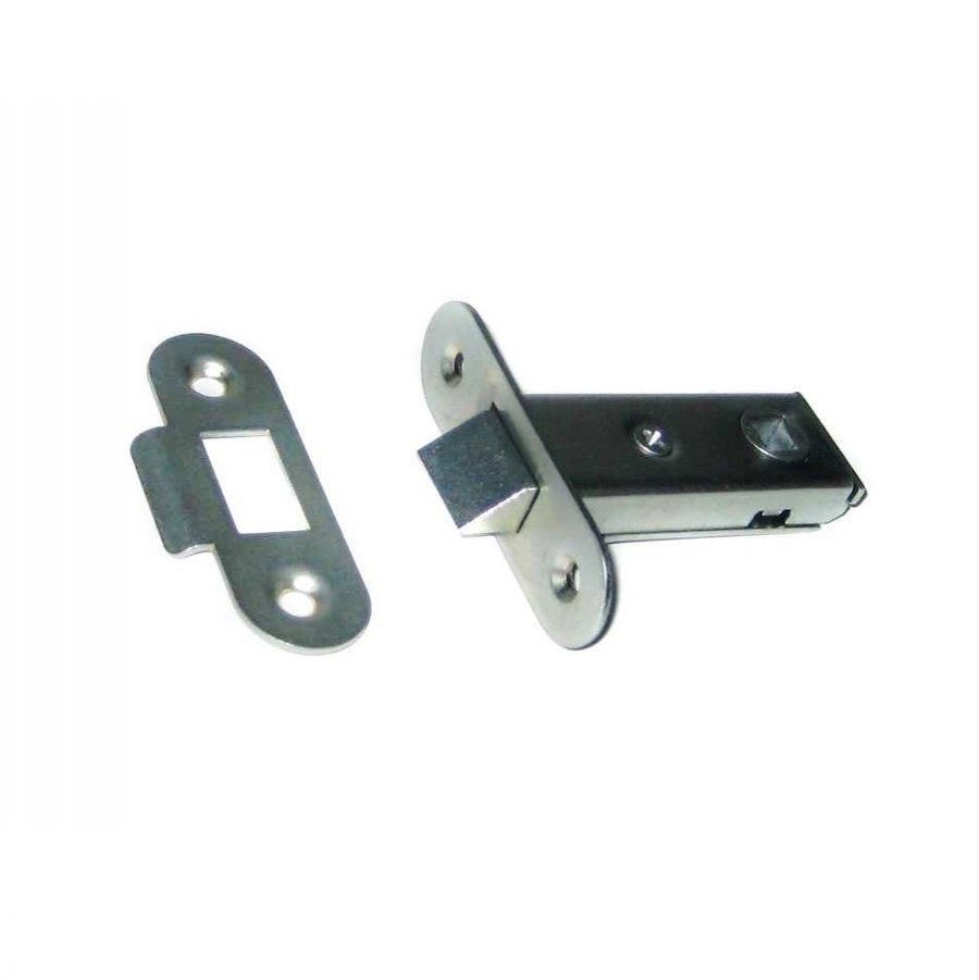 Корпус защёлки стальной, сама защёлка - цинковый сплав. Комплектность: защёлка - 1 шт., планка запорная - 1шт., шуруп 4х25 - 4 шт., стержень (квадратное сечение) - 1 шт.